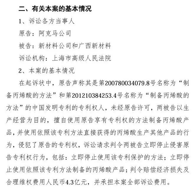 第200780034079.8号名称为“制备丙烯酸的方法”涉案专利是陶氏化学于2007年申请的,2010年转让给了阿克马公司;