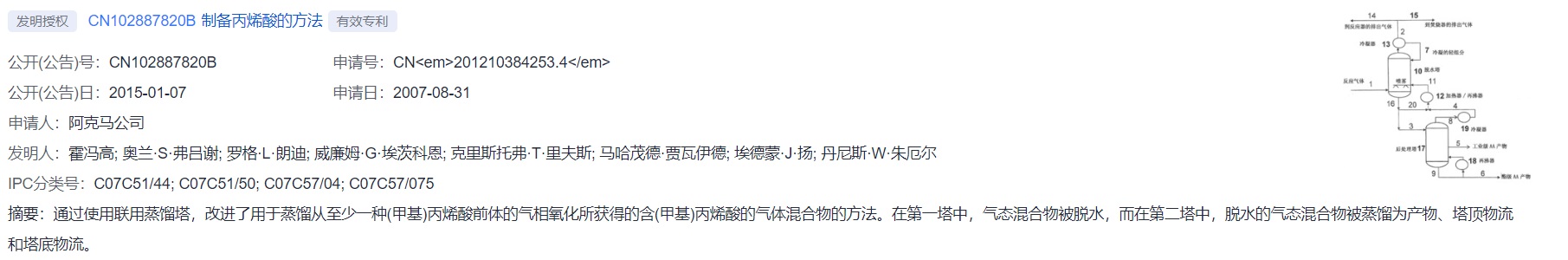 而第201210384253.4号名称为“制备丙烯酸的方法”专利实际申请于2012年,是前述专利的分案,由阿克马公司申请。