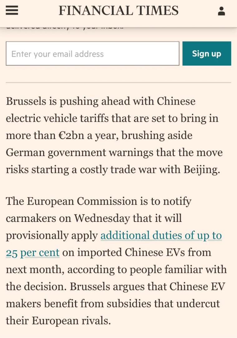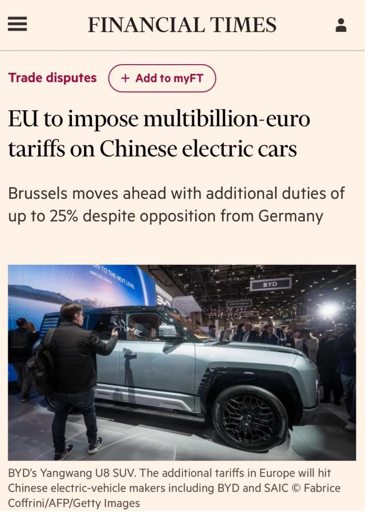 当地时间6月12日早,《金融时报》援引知情人士称,欧盟委员会决定向中国电动车征收额外关税,尽管这项措施遭到德国的反对。
