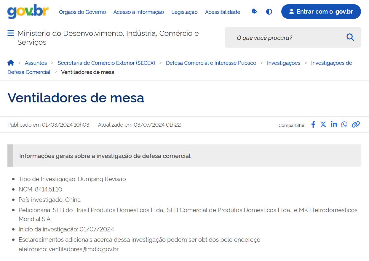 据报道,巴西发展、工业、贸易和服务部外贸秘书处发布2024年第28号公告,应巴西国内企业SEB do Brasil Produtos Domésticos Ltda.、SEB Comercial de Produtos Domésticos Ltda.以及MK Eletrodomésticos Mondial S.A.于2024年1月31日提交的申请,对原产于中国的台扇(ventiladores de mesa)发起第五次反倾销日落复审调查。