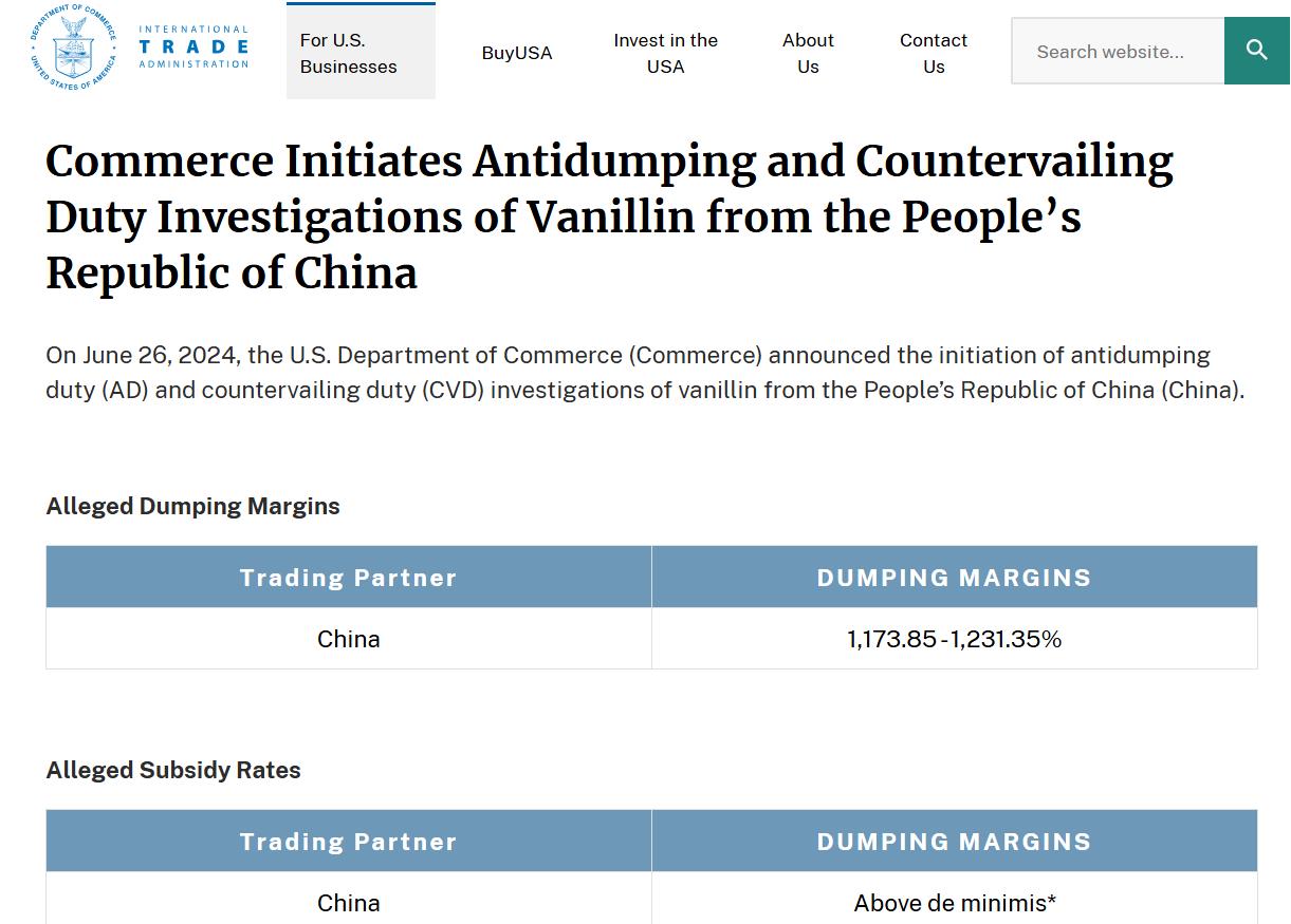 2024年6月26日,美国商务部宣布启动对中华人民共和国香兰素的反倾销税和反补贴税调查。