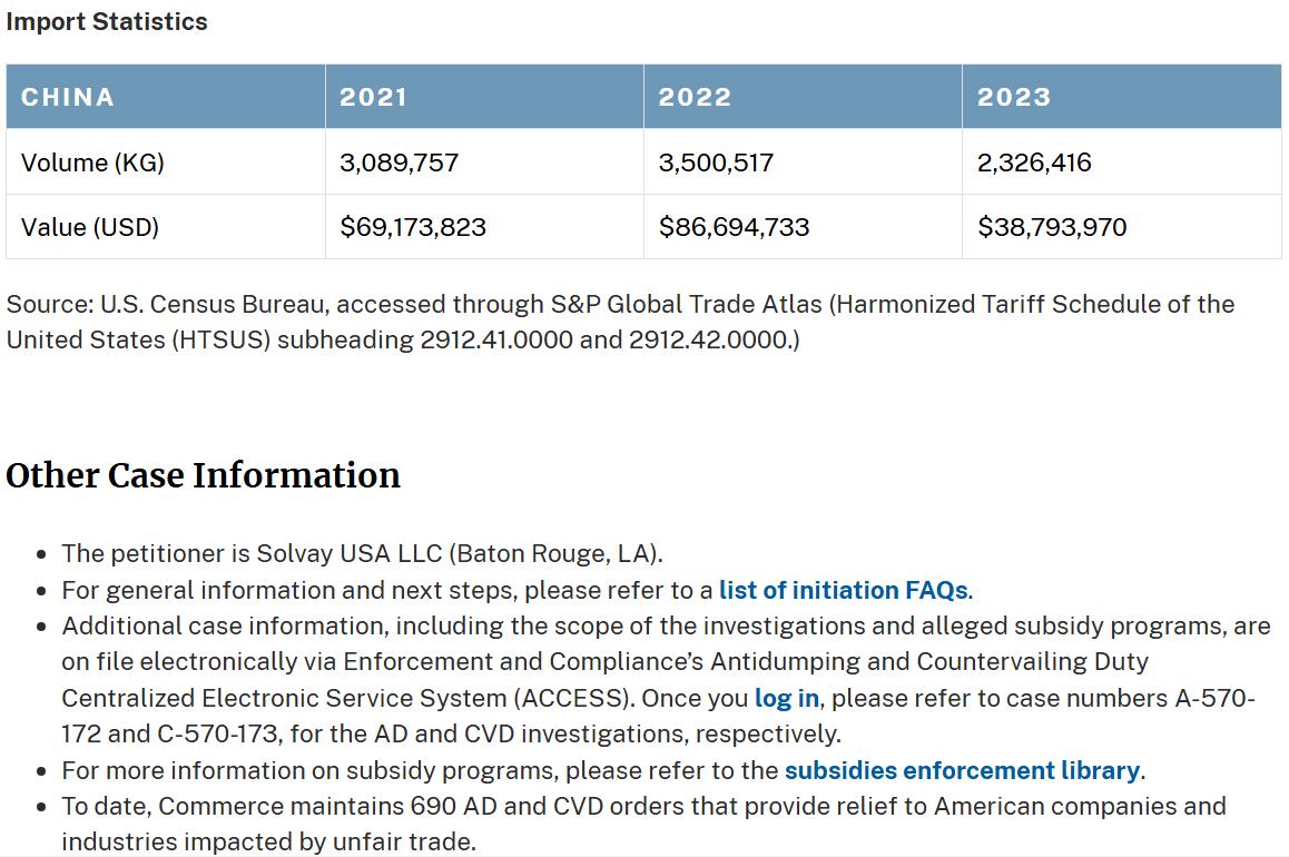 ITC自动立案进行损害初裁调查。涉案产品海关编码为2912.41.0000和2912.42.0000(USHTS进口税则号)。