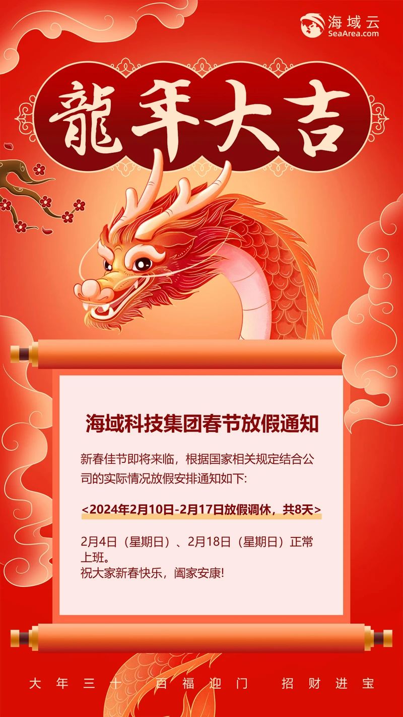 根据国家2024年春节假期放假安排通知,海域云放假安排如下: