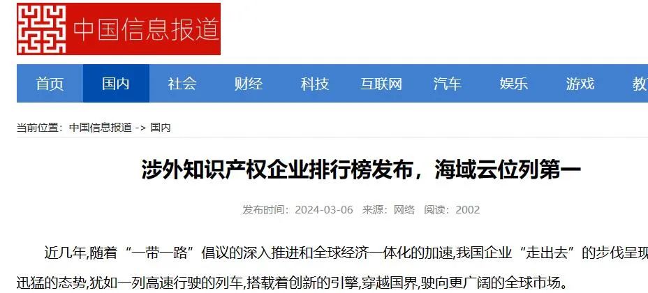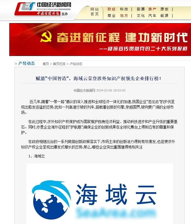 近期,在政府出台一系列知识产权政策,大力鼓励创新的背景下,凤凰网、中国经济新闻网、中国经济报道、赛迪网、中华网等多家媒体对该领域的企业进行特别关注报道,其中海域云荣登涉外知识产权领先企业排行榜首。