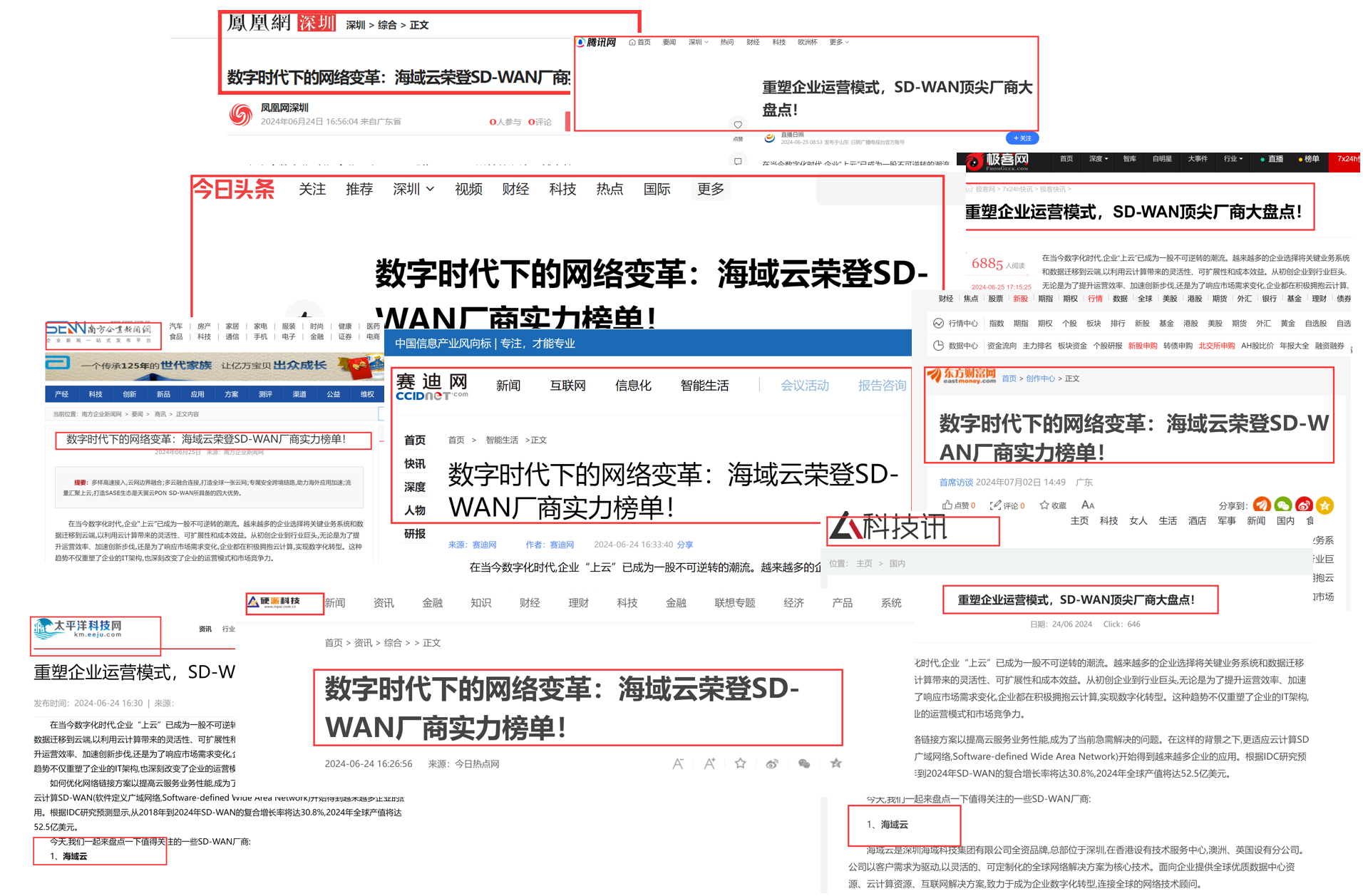 在这一背景下,SD-WAN技术以其卓越的性能和灵活性,迅速成为企业网络建设的新宠。近期,凤凰网、科技之声、软件日报、科技时报、大众网等30多家媒体对该领域的企业进行特别关注报道,其中,海域云凭借其在SD-WAN领域的创新实践和卓越表现,荣登SD-WAN厂商实力榜单,这不仅是对海域云技术实力的肯定,更是对其服务品质的认可。