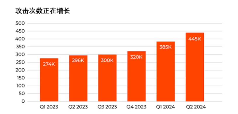 CCF计算机安全专委会曾发文表示,2024年上半年的DDoS攻击次数与去年同期相比增加了46%,2024年第二季度达到445K次。与前六个月(2023年第三至第四季度)的数据相比,增加了34%。