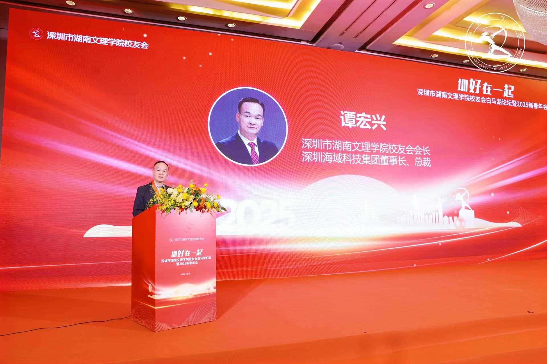 12月22日,“圳好在一起”,深圳市湖南文理学院校友会白马湖论坛暨2025新春年会在深圳会展中心隆重举行。海域科技集团董事长谭宏兴作为湖南文理学院深圳校友会会长出席并致辞。