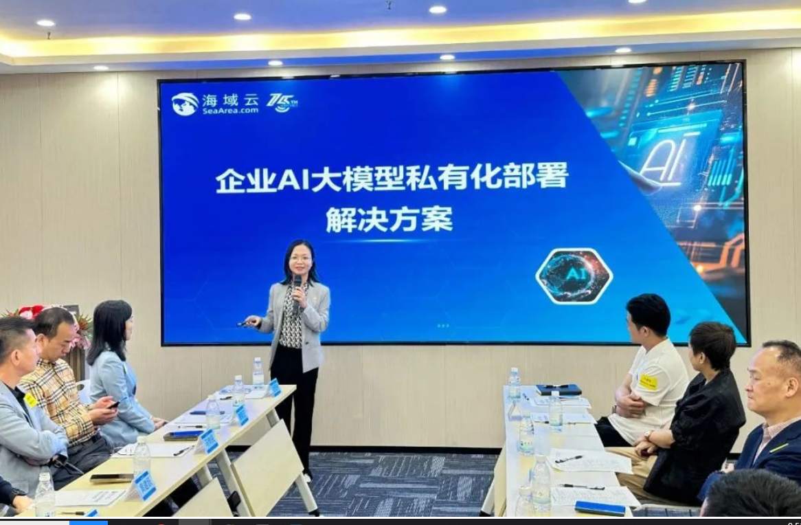 在技术分享环节,冯超筠书记从专业角度作"企业AI大模型私有化部署"专题分享。她从基础概念入手,深入剖析私有化部署优势,重点推介海域云特色方案,并结合丰富案例展示应用成效,为与会企业提供实践指导。