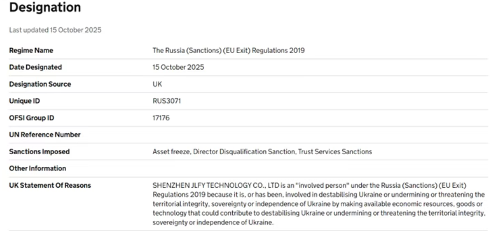英国政府官网相关信息截图 此外从英国政府官网相关网页列表中输入“Shenzhen”可以查到因俄罗斯相关而被列入英国制裁的深圳企业一共有7家。