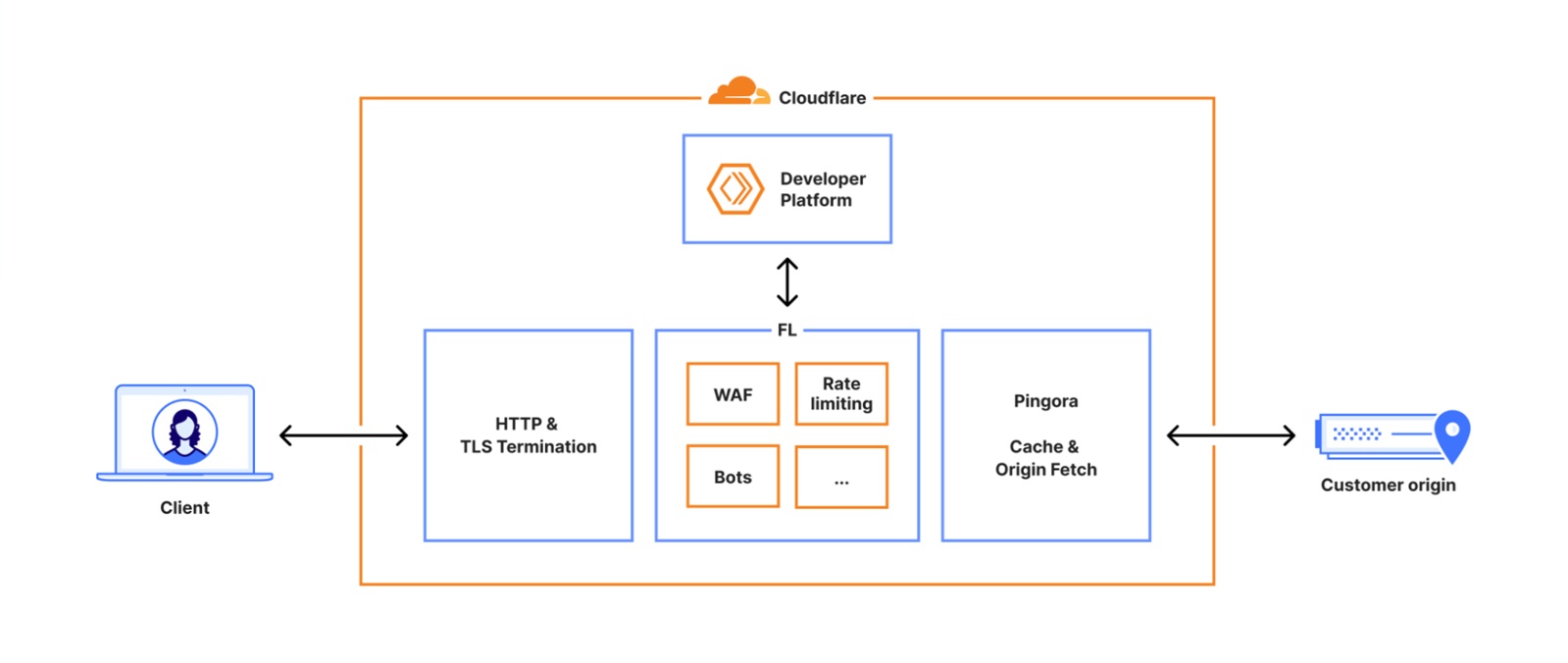 每个发送到 Cloudflare 的请求都会沿着我们网络中预设的路径进行。这些请求可能来自加载网页的浏览器、调用 API 的移动应用,或是来自其他服务的自动化流量。这些请求首先在我们的 HTTP 和 TLS 层终止,然后流入我们的核心代理系统(我们称之为 FL,即“Frontline”),最后通过 Pingora。Pingora 会根据需要进行缓存查询或从源服务器获取数据。