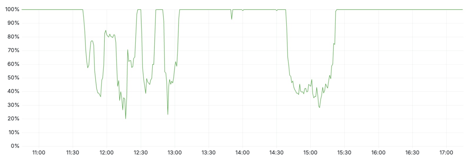 Turnstile系统受到此次故障的影响,导致没有活跃控制面板会话的客户无法登录。如下图所示,在两个时间段内,系统可用性有所降低:11:30至13:10,以及14:40至15:30。