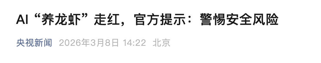 3月8日下午,央视发文:《AI养“龙虾”警惕安全风险》——