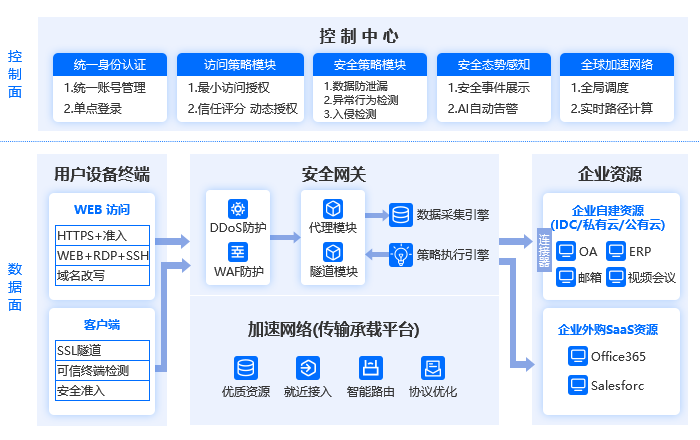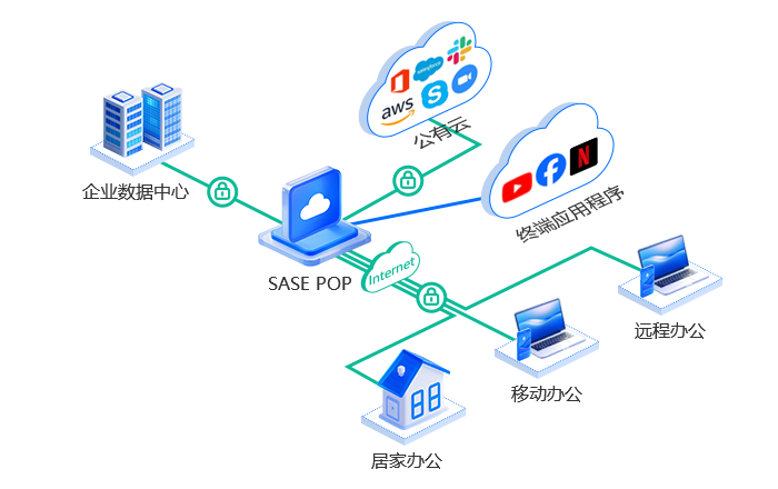 通过优化的网络路径和云原生架构,SASE PoP就近接入,确保用户能够快速、无缝地访问企业资源和互联网,且能快速开局与部署。