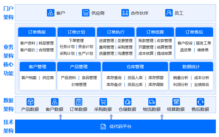 业务中台是面向企业端到端的业务交付体系,围绕订单、货物和资金三大流程展开。通过打通各业务板块的链接与协同,包括供应商、制造商、物流服务提供商和销售商等,实现业务互联互通、信息共享和资源协调,且低代码平台的灵活配置、编排与业务扩展能力,支持数字化应用的快速迭代与更新,助力企业实现智能化转型。
