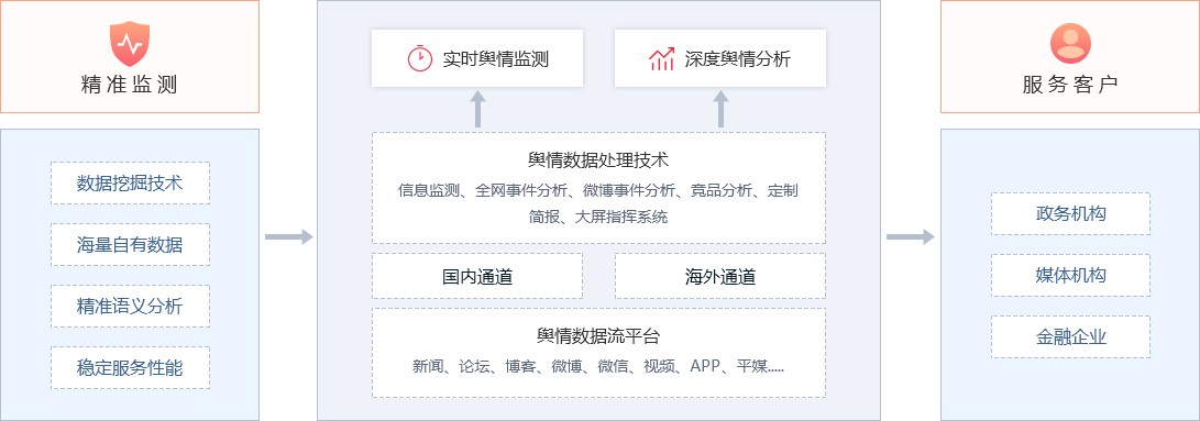 社会化大数据时代,媒体行业的内容生产方式在悄然转变,针对社交媒体环境下,信息传播去中心化,热点事件爆发的不确定性,海域云提供优质的互联网舆情监测服务,监测覆盖新闻、论坛、博客、微博、微信、视频、APP、平媒等众多网络媒体及电视频道,多载体、多维度收集、存储和分析海量的互联网舆情信息,全面实现为政府广纳民言,为企业收集情报,帮助用户及时发现舆情、跟踪舆情、了解舆情发展的整个过程。有助于政府机构、企事业单位精准、及时、全面的掌握关于自身的互联网舆情信息,提高舆情应对能力,增强企业在互联网时代品牌传播的有效性、安全性和美誉度。