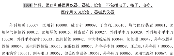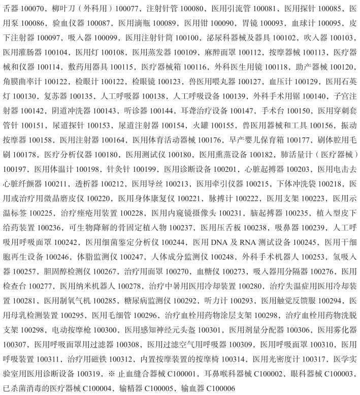 外科用剪100007; 医用针100008; 缝合针100009; 子宫托100010; 热气医疗装置100011; 医用热气颤振器100012; 医用导管100015; 牲畜助产器100027; 外科手术刀100029; 外科用小手术刀100030; 外科手术探针100033; 医用插管100042; 冲洗体腔装置100044; 阉割钳100049; 外科仪器和器械100054; 医生用器械箱100055; 麻醉仪器100057; 外科手术剪100058; 压迫机(外科用)100060; 医用滴管100061; 割鸡眼刀100062; 健美按摩设备100063; 外科用刀100065; 医用恒温箱100067; 柳叶刀(外科用)100077; 注射针管100080; 医用引流管100081; 医用探针100085; 医用泵100086; 验血仪器100087; 医用滴瓶100089; 医用钳100090; 胃镜100093; 血球计100095; 皮下注射器100097; 吸入器100099; 医用注射针筒100100; 泌尿科器械及器具100102; 吹入器100103; 医用灌肠器100104; 医用灯100108; 医用蒸发器100109; 麻醉面罩100112; 按摩器械100113; 医疗器械和仪器100114; 敷药用器具100115; 医疗器械箱100116; 外科医生用镜100118; 助产器械100120; 检眼计100122; 角膜曲率计100122; 检眼镜100123; 兽医用喂丸器100127; 血压计100129; 医用石英灯100130; 复苏器100135; 人工呼吸器100138; 人工呼吸设备100139; 外科手术用锯100140; 子宫注射器100142; 阴道冲洗器100143; 听诊器100144; 耳聋治疗设备100147; 手术台100150; 医用穿刺套管针100151; 尿道探针100153; 尿道注射器100154; 火罐100155; 兽医用器械和工具100156; 振动按摩器100158; 医用注射器100164; 医用体育活动器械100176; 早产婴儿保育箱100177; 刷体腔用毛刷100178; 医用测试仪100180; 医疗分析仪器100180; 医用吸入剂给药装置100182; 肺活量计(医疗器械)100197; 医用体温计100198; 针灸针100199; 医用诊断设备100201; 心脏起搏器100203; 医用电击去心脏纤颤器100211; 透析器100212; 医用导丝100213; 医用牵引仪器100215; 下体冲洗袋100218; 医用或治疗用微晶磨皮仪100220; 医用身体康复仪100221; 脉搏计100222; 医用支架100223; 医用示温标签100225; 治疗痤疮用装置100228; 医用内窥镜摄像头100231; 脑起搏器100235; 植入型皮下给药装置100236; 可生物降解的骨固定植入物100237; 医用压舌板100238; 吸鼻器100239; 人工呼吸用呼吸面罩100242; 医用细菌鉴定分析仪100244; 医用DNA及RNA测试设备100245; 医用干细胞再生设备100246; 体脂监测仪100247; 人体成分监测仪100248; 外科手术机器人100253; 氢吸入器100257; 胆固醇检测仪100267; 治疗用面罩100270; 血糖仪100273; 吸入器用分隔器100276; 医用检查台100277; 医用纳米机器人100278; 治疗中暑用医用冷却装置100280; 治疗失温症用医用冷却装置100281; 医用制氧气机100285; 糖尿病监测仪100292; 听力计100293; 医用触觉反馈服100294; 医用母乳检测装置100295; 医用毛细管100296; 治疗血栓用药物洗脱支架100298; 治疗血栓用药物涂层支架100298; 电动按摩枪100300; 医用感知神经元头盔100301; 医用剂量分配器100306; 医用雾化器100307; 医用呼吸面罩用过滤器100308; 医用过滤空气用呼吸器100309; 医用呼吸面罩100310; 医用呼吸装置100311; 治疗用磁铁100312; 内置按摩装置的按摩椅100314; 医用光密度计100317; 医学实验室用医用诊断设备100319; (辅助发声用)电子喉100324; 医用低温治疗设备100325; 兽医用低温治疗设备100326; 牲畜用自动接种疫苗设备100345; 医用黑头吸出器100347; 医用粉刺吸出器100347; 脸部按摩滚轮100348; 止血缝合器械; 耳鼻喉科器械; 眼科器械; 已杀菌消毒的医疗器械; 输精器; 输血器; 医用熏蒸设备; 医疗用颈颅刺激仪; 体外肺膜氧合机; 激光消融手术设备; 兽医用弹力去势器; 止鼾牙套; 治疗呼吸系统疾病的医疗器械和设备; 用于治疗呼吸系统疾病的医疗器械; 医用柔性内窥镜; 肺叶钳; 脊椎腔注射器; 脊椎牵开器; 毛细血管用引流管; 血压测量仪器; 心脏除颤电极; 中枢脊髓内钉; 胎心监测仪; 气管镜; 血氧监测仪; 身体组成成分检测仪; 眼科检查设备; 乳头切开刀; 拔罐疗法用罐; 可穿戴式医用生物特征数据监测器; 体温计; 医用喷雾器; 静脉留置针; 输血设备; 脉搏监测仪; 医用内窥镜; 括约肌切开器; 家用电动按摩装置; 艾灸器; 一次性注射器; 家用电动头皮按摩器; 医用血液和血液成分过滤器; 血栓检测仪; 外科手术针; 肛门镜; 静脉输液用瓶; 皮肤磨削机; 椎间盘修复用医疗设备; 关节镜; 兽医用剪牙钳; 兽医用脐带夹; 膀胱镜; 医用导线; 皮肤测试仪; 医用磨皮肤机; 治疗用锻炼机器; 家用电动美容按摩器械; 医用气相色谱仪; 血红蛋白计; 矫形用测角仪; 内瘘针; 医用切割设备; 显微皮肤磨削仪; 伤口引流器; 阴道镜; 套管针; 心率监视器; 检影镜; 用于儿童认知疗法的医疗机器人; 电动吸痰器; 结肠镜; 心肺复苏面罩; 呼吸监测仪; 可植入尿道支架; 商用电动头皮按摩器; 医用注射针; 医用红外测温仪; 灸疗用玻璃罐; 艾灸治疗用医疗器械; 测量瞳孔距离用瞳孔计; 测量瞳孔反映性刺激用瞳孔计; 医用基因检测设备; 医用脉搏血氧仪; 医用输血导管; 医用缝合伤口器械; 手术用骨锉; 医用喷雾器(空的); 外科用钻具; 柔性医用内窥镜; 刚性医用内窥镜; 医用外科设备和器械; 兽医用外科设备和器械; 外科整形用手术器械; 脊柱外科用手术器械; 治疗用输液器; 治疗用灌洗器; 妇科用扩张器; 医用叩诊锤; 尖刮匙; 注射针; 鼓膜穿刺管; 刚性气管镜; 柔性气管镜; 食管镜; 刚性食管镜; 柔性食管镜; 尿道导管; 披肩式按摩器; 脉搏测量装置; 胸部叩诊器; 唇牵开器; 直肠扩张器; 医用眼底照相机; 血液辊轴混匀器; 医用皮肤水分测