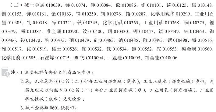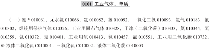 碱土金属010039; 氨010061; 无水氨010066; 锑010074; 氩010082; 砷010084; 砹010086; 氮010092; 一氧化二氮010093; 钡010101; 铋010125; 碳010148; 镥010153; 铈010161; 铯010163; 氯气010183; 镝010250; 铒010276; 铕010287; 化学用硫华010299; 氟010302; 工业用石墨010305; 钆010318; 镓010321; 焊接用保护气体010326; 工业用固态气体010328; 干冰(二氧化碳)010333; 氦010344; 钬010345; 氢010359; 化学用碘010365; 工业用碘010368; 氪010372; 镧010375; 锂010379; 汞010387; 准金属010390; 钕010400; 氖010401; 工业用氧010413; 磷010430; 钾010447; 镨010449; 氡010457; 铼010463; 铷010466; 钐010470; 钪010473; 硒010479; 硅010483; 钠010485; 硫010493; 锶010498; 锝010516; 碲010517; 铽010519; 稀土010526; 铊010532; 铥010534; 氙010551; 镱010552; 钇010553; 碱金属010560; 化学用溴010585; 石墨烯010715; 工业用二氧化碳010732; 液体二氧化硫; 三氧化硫; 液体二氧化碳; 钙; 工业硅; 结晶硅; 工业用人造石墨; 二氧化硫; 稀土金属; 天然石墨; 氢气; 纳米石墨烯; 液态氯; 半导体用硅; 工业用天然石墨; 六氟化硫; 蓄电池用人造石墨; 焊接用固态保护气体; 一氧化碳; 硼; 光气(碳酰氯); 硫(非金属元素); 硫(非金属矿物); 亚硫酸气体(二氧化硫); 游泳池用氯气; 硫磺; 氙气; 太阳能电池用硅; 二氧化氯; 硫化氢; 锑粉; 氘; 氘气; 蓄电池用碳粉; 液态空气; 压缩氢气; 氧; 压缩氮气; 液氨; 混合稀土金属; 溴素; 碳酸气; 工业用氨; 溴;