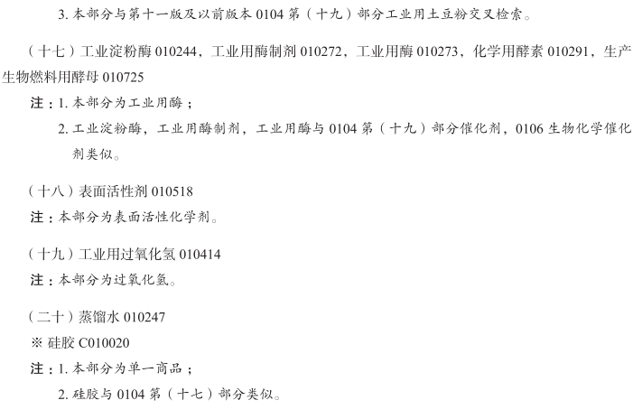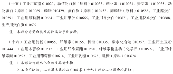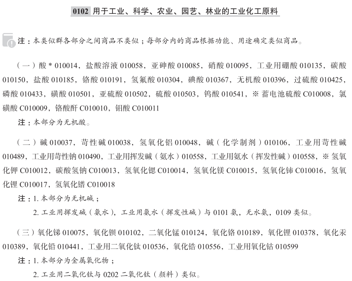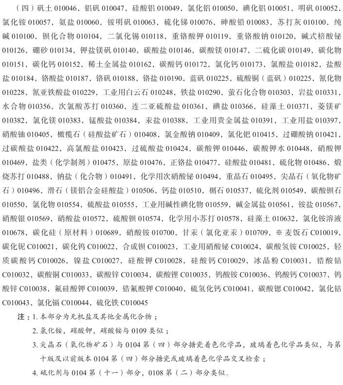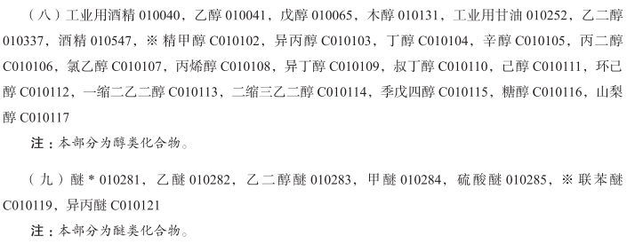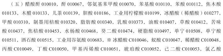 醋酸盐(化学品)010007; 醋酸酐010010; 丙酮010011; 乙炔010012; 四氯乙烷010013; 酸010014; 工业用琼脂010029; 动植物白朊(原料)010033; 碘化蛋白010034; 麦芽蛋白010035; 碱010037; 苛性碱010038; 工业用酒精010040; 乙醇010041; 醛010042; 矾土010046; 铝矾010047; 氢氧化铝010048; 硅酸铝010049; 氯化铝010050; 碘化铝010051; 明矾010052; 工业用淀粉010055; 氯化铵010057; 盐酸溶液010058; 氨盐010060; 氨醛010062; 铵明矾010063; 乙酸戊酯010064; 戊醇010065; 酐010067; 邻氨基苯甲酸010070; 氧化锑010075; 硫化锑010076; 砷酸铅010083; 亚砷酸010085; 硝酸010095; 纯碱010100; 苏打灰010100; 氧化钡010102; 钡化合物010104; 碱(化学制剂)010106; 苯基酸010110; 苯衍生物010111; 苯酸010112; 二氯化锡010118; 重铬酸钾010119; 重铬酸钠010120; 草酸氢钾010123; 二氧化锰010124; 碱式棓酸铋010126; 木醇010131; 木醋010133; 焦木酸010133; 硼砂010134; 工业用硼酸010135; 儿茶010139; 钾盐镁矾010140; 碳酸盐010146; 碳酸镁010147; 二硫化碳010149; 碳酸010150; 碳化物010151; 碳化钙010152; 纤维素010155; 稀土金属盐010162; 酮010164; 醋酸钙010171; 碳酸钙010172; 氯化钙010173; 氯酸盐010182; 盐酸盐010184; 盐酸010185; 胆酸010186; 铬酸盐010187; 铬矾010188; 氧化铬010189; 铬盐010190; 铬酸010191; 工业用柠檬酸010199; 化学用酒石酸氢钾010219; 巴豆醛010220; 蓝矾010225; 硫酸铜(蓝矾)010225; 氰化物010228; 氰亚铁酸盐010229; 甲基异丙基苯010230; 工业淀粉酶010244; 蒸馏水010247; 工业用白云石010248; 工业用甘油010252; 工业用酶制剂010272; 工业用酶010273; 冰醋酸(稀醋酸)010277; 酯010279; 乙烷010280; 醚010281; 乙醚010282; 乙二醇醚010283; 甲醚010284; 硫酸醚010285; 工业用谷粉010289; 铁盐010290; 化学用酵素010291; 萤石化合物010303; 氢氟酸010304; 甲酸010310; 化学用甲醛010311; 制墨用棓酸010320; 岩盐010331; 糖苷010335; 甘油酯010336; 乙二醇010337; 脂肪酸010340; 水合物010356; 碳水化合物010357; 联氨010358; 次氯酸苏打010360; 连二亚硫酸盐010361; 碘盐010366; 碘酸010367; 乳酸010373; 氧化锂010378; 菱镁矿010382; 氯化镁010383; 锰酸盐010384; 汞盐010388; 氧化汞010389; 工业用贵金属盐010391; 甲烷010394; 无机酸010396; 工业用盐010397; 萘010399; 硝酸铀010405; 油酸010407; 橄榄石(硅酸盐矿石)010408; 氯金酸钠010409; 一水草酸氢钾010410; 草酸盐010411; 草酸010412; 工业用过氧化氢010414; 氯化钯010415; 过硼酸钠010421; 过碳酸盐010422; 高氯酸盐010423; 过硫酸盐010424; 过硫酸010425; 工业用酚010426; 磷脂010429; 磷酸010433; 苦味酸010437; 醋酸铅010440; 氧化铅010441; 工业用土豆粉010444; 碳酸钾010446; 碳酸钾水010448; 蛋白质(原料)010452; 焦棓酸010453; 水杨酸010468; 硝酸钾010469; 癸二酸010474; 盐类(化学制剂)010475; 原盐010476; 正铬盐010477; 硅酸盐010481; 硫化物010486; 煅烧苏打010488; 工业用苛性碱010489; 工业用苛性钠010490; 钠盐(化合物)010491; 化学用次硝酸铋010494; 重晶石010495; 尖晶石(氧化物矿石)010496; 硬脂酸010497; 磺酸010501; 亚硫酸010502; 硫酸010503; 滑石(镁铝合金硅酸盐)010506; 单宁010508; 钙盐010510; 单宁酸010511; 工业用木薯粉010512; 非药用酒石010514; 酒石酸010515; 表面活性剂010518; 四氯化碳010528; 四氯化物010529; 对称二苯硫脲010533; 工业用二氧化钛010536; 榍石010537; 甲苯010538; 钨酸010541; 酒精010547; 硫化剂010549; 碳酸钡石010550; 氯化物010554; 硫酸盐010555; 氧化锆010556; 工业用氨水(挥发性碱)010558; 工业用挥发碱(氨水)010558; 工业用碱性碘化物010559; 碱金属盐010561; 生物碱010562; 工业用藻酸盐010564; 乙酸铝010565; 醋酸铝010565; 铵盐010567; 硝酸银010569; 硝酸盐010572; 硫酸钡010574; 工业用甲基苯010576; 甲基苯010577; 化学用小苏打010578; 卵磷脂(原料)010588; 工业用纤维素酯010590; 工业酪蛋白010591; 纤维素衍生物(化学品)010592; 工业用纤维素醚010593; 工业用氧化钴010599; 工业用葡萄糖010614; 硅藻土010632; 工业用樟脑010638; 工业用卵磷脂010664; 工业用果胶010666; 工业用酒石酸氢钾010668; 工业用谷蛋白010671; 工业用乳糖010673; 乳糖(原料)010674; 氯化铵溶液010678; 工业用谷氨酸010683; 工业用胶原蛋白010688; 碳化硅(原材料)010689; 生产用蛋白质010697; 硝酸铵010700; 工业用类黄酮(酚类化合物)010703; 工业用麝香草酚010704; 甘汞(氯化亚汞)010709; 混合二甲苯010711; 二甲苯010712; 苯010713; 粗制苯010714; 生产生物燃料用酵母010725; 萜烯烃010743; 磷酸铁锂010745; 钴酸锂010746; 蓄电池硫酸; 氯磺酸; 铬酸酐; 钼酸; 氢氧化钾; 碳酸氢钠; 氢氧化锶; 氢氧化镁; 氢氧化铈; 氢氧化锂; 氢氧化镨; 麦饭石; 硅胶; 碳化铌; 碳化钨; 合成钡; 工业用硝酸铋; 碳酸氢铵; 轻质碳酸钙; 镍盐; 硅酸钾; 硅酸钙; 冰晶粉; 锆酸钴; 碳酸铜; 碳酸锌; 碳酸锂; 钨酸铵; 钨酸钙; 钨酸锌; 氟硅酸钾; 锆氟酸钾; 硫氢化钙; 碳酸锶; 氯化钴; 氯化镉; 硫化铁; 冰醋酸; 蚁酸; 稀醋酸; 丙酸; 丁酸; 甲基丙烯酸; 琥珀酸; 己二酸; 氯乙酸; 环烷酸; 石油磺酸; 对苯二甲酸; 苯醋酸; 邻苯二甲酸酐; 顺丁烯二酸酐(即失水草果酸酐); 米吐尔; 氯化苄; 蚁酸钠; 醋酸钾; 醋酸锌; 醋酸钴; 醋酸锰; 吐酒石(即酒石酸锑钾); 酒石酸锑钠; 肉桂油; 戊基醋酸盐; 没食子酸; 乙烯; 丁烯; 异丁烯; 异戊二烯; 乙基苯; 苯乙烯; 异丙苯; 苯烷; 苯胺; 轻苯; 氯乙烯; 氯丁二烯; 二氯乙烷; 环氧丙烷; 一氯甲烷; 二氯甲烷; 工业用三氯甲烷; 氯乙烷; 三氯乙烯; 过氯乙烯; 偏氯乙烯; 对二氯苯; 邻二氯苯; 二硝基氯化苯; 对硝基氯化苯; 邻硝基氯化苯; 联苯; 间二氯苯; 精甲