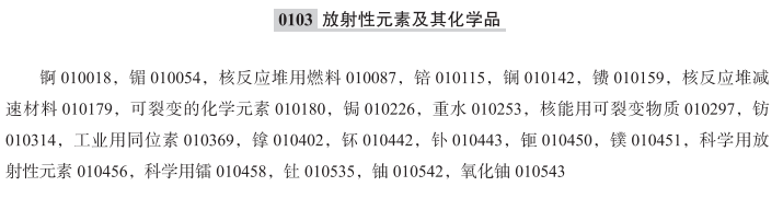 锕010018; 镅010054; 核反应堆用燃料010087; 锫010115; 锎010142; 镄010159; 核反应堆减速材料010179; 可裂变的化学元素010180; 锔010226; 重水010253; 核能用可裂变物质010297; 钫010314; 工业用同位素010369; 镎010402; 钚010442; 钋010443; 钷010450; 镤010451; 科学用放射性元素010456; 科学用镭010458; 钍010535; 铀010542; 氧化铀010543; 加工过的铀; 原子堆用燃料; 镭; 天然铀;