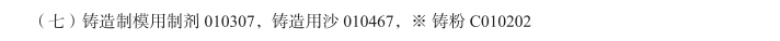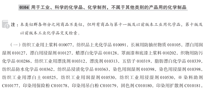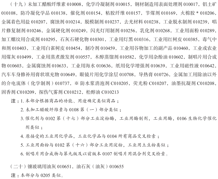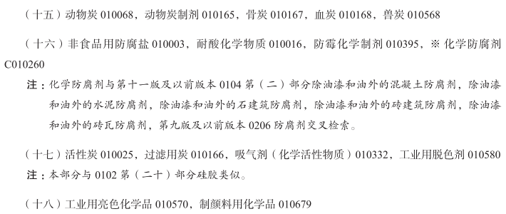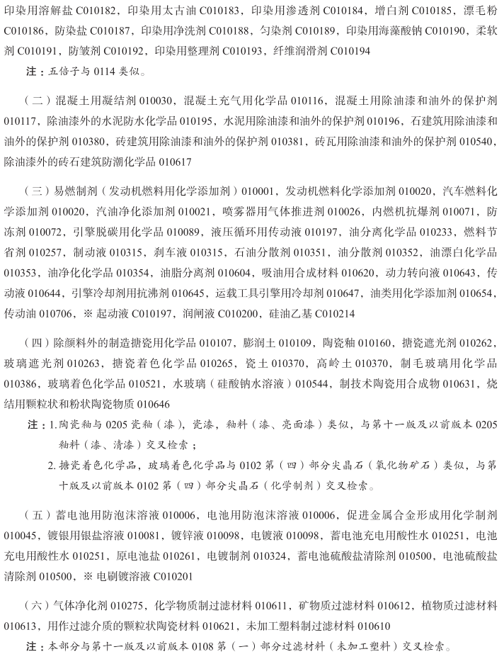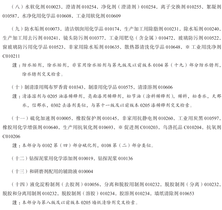 易燃制剂(发动机燃料用化学添加剂)010001; 非食品用防腐盐010003; 和研磨剂配用的辅助液010004; 硫化加速剂010005; 蓄电池用防泡沫溶液010006; 电池用防泡沫溶液010006; 未加工醋酸纤维素010008; 化学冷凝制剂010015; 耐酸化学物质010016; 钢材制造用表面处理剂010017; 钻探泥浆用化学添加剂010019; 发动机燃料化学添加剂010020; 汽车燃料化学添加剂010020; 汽油净化添加剂010021; 水软化剂010023; 活性炭010025; 喷雾器用气体推进剂010026; 混凝土用凝结剂010030; 促进金属合金形成用化学制剂010045; 液化淀粉制剂(去胶剂)010056; 动物炭010068; 内燃机抗爆剂010071; 防冻剂010072; 防水垢剂010073; 纺织工业用上浆料010077; 镀银用银盐溶液010081; 引擎脱碳用化学品010089; 纺织品上光化学品010091; 电镀液010098; 镀锌液010098; 长袜用防抽丝物质010105; 除颜料外的制造搪瓷用化学品010107; 铝土矿010108; 膨润土010109; 混凝土充气用化学品010116; 混凝土用除油漆和油外的保护剂010117; 漂白用浸湿剂010127; 漂白用润湿剂010127; 蜡漂白化学品010128; 钻探泥浆010136; 防冷凝化学品010138; 橡胶保护剂010145; 催化剂010154; 粘胶纤维010157; 陶瓷釉010160; 动物炭制剂010165; 过滤用炭010166; 骨炭010167; 血炭010168; 节煤剂010169; 清洁烟囱用化学品010174; 除油漆外的水泥防水化学品010195; 水泥用除油漆和油外的保护剂010196; 液压循环用传动液010197; 罩面漆和底漆上浆料010202; 火棉胶010206; 金属着色用盐010207; 腐蚀剂010214; 生产加工用除脂剂010231; 分离和脱胶用制剂010232; 脱胶制剂(分离)010232; 脱胶和分离用制剂010232; 油分离化学品010233; 脱胶制剂(溶胶)010234; 胶溶剂010234; 脱模制剂010237; 去光材料010238; 工业脱水制剂010239; 除水垢剂010240; 生产加工用去污剂010241; 唱片修复制剂010246; 金属硬化剂010249; 电池充电用酸性水010251; 蓄电池充电用酸性水010251; 澄清剂010254; 净化剂(澄清剂)010254; 离子交换剂010255; 闪光灯用制剂010256; 燃料节省剂010257; 非家用抗静电剂010260; 原电池盐010261; 搪瓷遮光剂010262; 玻璃遮光剂010263; 搪瓷着色化学品010265; 乳化剂010268; 气体净化剂010275; 织物用防污化学品010286; 加工螺纹用合成剂010295; 石灰石硬化物010301; 铸造制模用制剂010307; 纺织工业用漂洗剂010312; 漂洗剂010313; 刹车液010315; 制动液010315; 工业用灯黑010316; 五倍子010319; 电镀制剂010324; 吸气剂(化学活性物质)010332; 脂肪漂白化学品010339; 制清漆用羯布罗香膏010343; 石油分散剂010351; 油分散剂010352; 油漂白化学品010353; 油净化化学品010354; 纺织品防水化学品010362; 纺织品浸渍化学品010363; 瓷土010370; 高岭土010370; 镜头防污剂010377; 石建筑用除油漆和油外的保护剂010380; 砖建筑用除油漆和油外的保护剂010381; 工业用红树皮010385; 制毛玻璃用化学品010386; 防霉化学制剂010395; 染色用浸湿剂010398; 染色用润湿剂010398; 毒气中和剂010403; 工业用白雀树皮010454; 制冷剂010459; 工业用谷物加工的副产品010460; 铸造用沙010467; 工业用肥皂(含金属)010472; 工业或农业用煤灰010499; 电池硫酸盐清除剂010500; 蓄电池硫酸盐清除剂010500; 玻璃着色化学品010521; 玻璃防污剂010522; 窗玻璃防污用化学品010523; 纺织工业用漂白土010525; 纺织工业用浸湿剂010530; 纺织工业用润湿剂010530; 砖瓦用除油漆和油外的保护剂010540; 水玻璃(硅酸钠水溶液)010544; 工业用蒸煮激发剂010557; 兽炭010568; 工业用亮色化学品010570; 制漆用化学品010575; 工业用脱色剂010580; 木醇蒸馏剂010582; 絮凝剂010587; 工业用炭黑010597; 化学用杂酚油010602; 制唱片用合成物010603; 油脂分离剂010604; 清漆溶剂010606; 水净化用化学品010608; 工业用软化剂010609; 未加工塑料制过滤材料010610; 化学物质制过滤材料010611; 矿物质过滤材料010612; 植物质过滤材料010613; 除油漆外的砖石建筑防潮化学品010617; 吸油用合成材料010620; 用作过滤介质的颗粒状陶瓷材料010621; 制技术陶瓷用合成物010631; 金属腐蚀剂010633; 非家用除水垢剂010635; 工业用海水010636; 纸用化学增强剂010639; 橡胶用化学增强剂010640; 工业用磁性液010642; 动力转向液010643; 传动液010644; 引擎冷却剂用抗沸剂010645; 烧结用颗粒状和粉状陶瓷物质010646; 运载工具引擎用冷却剂010647; 散热器清洗化学品010648; 汽车车身修补用膏状填充物010649; 镶玻璃用油灰010651; 墙纸清除剂010653; 油类用化学添加剂010654; 制颜料用化学品010679; 生产用抗氧化剂010693; 传动油010706; 眼镜片用化学涂层010708; 导热膏010726; 金属加工用除油以外的介电流体(化学制剂)010737; 染料助剂; 印染用保险粉; 印染用吊白粉; 固色剂; 印染用扩散剂; 印染用溶解盐; 印染用太古油; 印染用渗透剂; 增白剂; 漂毛粉; 防染盐; 印染用净洗剂; 匀染剂; 印染用海藻酸钠; 柔软剂; 防皱剂; 印染用整理剂; 纤维润滑剂; 起动液; 润闸液; 电刷镀溶液; 铸粉; 促进剂; 乌洛托品; 防水浆消泡剂; 抗氧剂; 荧光粉; 油墨抗凝剂; 固香剂; 工业用洗净剂; 探伤气雾剂; 松醇油; 硅油乙基; 化学防腐剂; 混凝土用减水剂; 渗碳剂; 工业用清洁剂; 防止霉菌生长的抑霉化学品; 服装防皱剂; 清除墙纸用合成物; 生产加工中增亮染料用化学制剂; 养护混凝土用化合物; 融化冰雪用化学制剂; 工业用糊精; 除冰用液体盐; 生产聚氨酯用化学品; 钻油井用钻探泥浆; 光致抗蚀剂; 玻璃纤维工业用脱模化合物; 脱脂剂(非家用); 生产加工用脱脂溶剂; 过滤材料(矿物质); 汽油用化学添加剂; 糊精;