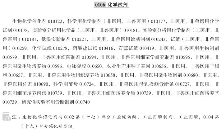 生物化学催化剂010122; 科学用化学制剂(非医用、非兽医用)010177; 非医用、非兽医用化学试剂010178; 实验室分析用化学制剂(非医用、非兽医用)010181; 实验室分析用化学品(非医用、非兽医用)010181; 低温实验制剂010221; 非医用、非兽医用诊断制剂010243; 试纸(非医用、非兽医用)010259; 化学试纸010278; 硝酸盐试纸010416; 石蕊试纸010419; 非医用、非兽医用生物制剂010579; 非医用、非兽医用细菌制剂010594; 非医用、非兽医用细菌学研究制剂010595; 非医用、非兽医用微生物培养物010596; 电泳凝胶010650; 农业生产用种子基因010656; 非医用、非兽医用干细胞010657; 非医用、非兽医用生物组织培养物010658; 非医用、非兽医用微生物制剂010680; 非医用、非兽医用佐剂010690; 科学用酵母010724; 非医用、非兽医用母乳检测诊断条010727; 非医用、非兽医用细菌培养肉汤010739; 非医用、非兽医用细菌培养基010739; 非医用、非兽医用细菌培养介质010739; 研究性实验室用诊断制剂010740; 非医用、非兽医用病毒010742; 科学用荧光染料010748; 分析化学用缓冲溶液; 检测游泳池水用化学制剂; 水产养殖用硝化细菌; 诊断试剂及制剂(医用和兽医用除外); 细胞培养用生物制剂(非医用、非兽医用); 科学研究用细胞生长培养基; 科学用试剂; 非医用生物化学试剂; 非医用、非兽医用电泳凝胶; 科学研究用细胞培养试剂; 科学用生物化学制剂; 用于农业种子制造的生物技术合成基因;