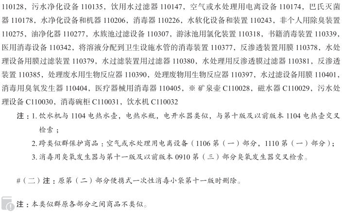 消毒设备110115; 海水淡化装置110116; 水净化装置110123; 水过滤器110124; 水消毒器110128; 污水净化设备110135; 饮用水过滤器110147; 空气或水处理用电离设备110174; 巴氏灭菌器110178; 水净化设备和机器110206; 消毒器110226; 水软化设备和装置110243; 非个人用除臭装置110275; 油净化器110277; 水族池过滤设备110307; 游泳池用氯化装置110318; 书籍消毒装置110339; 医用消毒设备110342; 将溶液分配到卫生设施水管的消毒装置110377; 反渗透装置用膜110378; 水处理设备用膜过滤装置110379; 水过滤装置用过滤器110380; 水处理用反渗透膜过滤器110381; 反渗透装置110385; 处理废水用生物反应器110390; 处理废物用生物反应器110397; 水过滤设备用膜110401; 消毒用臭氧发生器110404; 医疗器械用消毒器110405; 喷雾器(消毒设备)110418; 矿泉壶; 磁水器; 污水处理设备; 消毒碗柜; 饮水机; 水处理用紫外线消毒器; 奶瓶用电消毒器; 水处理用氯化装置; 水净化罐; 工业用水净化装置; 空气处理电离设备; 家用电解水机; 家用电净水器; 家庭卫生间用紫外线消毒器; 水处理过滤器; 医用消毒器; 喷雾消毒机; 水净化机; 臭氧消毒机; 滤水器; 海水淡化设备; 水淡化装置; 工业用盘消毒装置; 家用电动洗澡水净化装置; 运载工具轮胎消毒设备; 运载工具轮子消毒设备; 家用鞋子消毒器; 家用超声波消毒器; 自来水净化设备; 电热奶瓶消毒锅; 家用水龙头过滤器; 家用水净化器; 雨水净化装置; 纸币消毒机器; 纸币消毒设备; 污水净化装置; 家用离子水机; 污水处置设备; 家用粉扑紫外线消毒器; 饮用水过滤设备; 水净化设备; 废水处理箱; 水过滤装置; 水净化器; 牛奶消毒器; 牙刷消毒器;