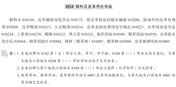 鞣料木010130; 皮革翻新用化学品010175; 除油外的皮革处理剂010208; 使皮革软化的脱灰碱液010208; 皮革鞣剂010215; 生皮鞣剂010216; 皮革表面处理用化学制品010223; 皮革浸渍化学品010224; 上浆剂010270; 鞣酸010323; 黑儿茶010325; 制革用油010349; 鞣革用油010350; 皮革防水化学品010364; 鞣革用漆叶010504; 鞣料(鞣革剂)010507; 鞣革物010509; 皮革整理用油010601; 皮革加工化学制剂;