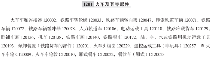 火车车厢连接器120002; 铁路车辆轮缘120033; 铁路车辆转向架120047; 缆索铁道车辆120071; 铁路车辆120072; 铁路车辆缓冲器120078; 人力轨道车120106; 电动运载工具120110; 铁路冷藏货车120129; 卧铺车厢120136; 机车120138; 铁路车厢120140; 铁路餐车120172; 陆、空、水或铁路用机动运载工具120193; 倾卸装置(铁路货车的部件)120201; 火车头烟囱120229; 遥控运载工具(非玩具)120257; 火车车轮; 火车车轮毂; 厢式餐车; 餐饮车(厢式); 公铁两用牵引车; 铁路客车门; 铁路车辆底架; 内燃机车; 自发电的电力机车(柴油电力机车); 电动铁道车辆; 轨道运载工具; 内燃有轨车; 氢燃料火车; 铁路货车; 陆地机动车辆; 电力机车; 车厢(铁路); 铁路车辆用座椅; 蒸汽机车; 牵引机车; 机动车辆; 陆用机动运载工具; 铁路车辆底盘; 火车车轮轮缘; 货运列车; 铁路车辆车身; 铁路客车;
