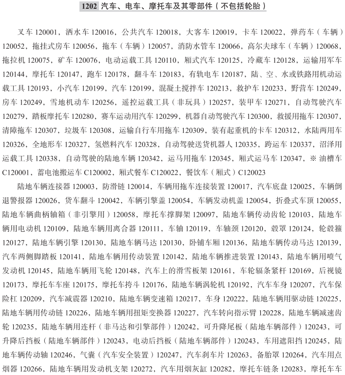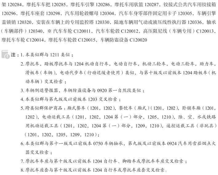 消防车090298; 叉车120001; 陆地车辆连接器120003; 防滑链120014; 洒水车120016; 车辆用拖车连接装置120017; 公共汽车120018; 大客车120019; 卡车120022; 汽车底盘120025; 车辆倒退警报器120026; 货车翻斗120042; 弹药车(车辆)120052; 车辆发动机盖120054; 车辆引擎盖120054; 折叠式车顶120055; 拖挂式房车120056; 拖车(车辆)120057; 陆地车辆曲柄轴箱(非引擎用)120058; 消防水管车120066; 高尔夫球车(车辆)120068; 拖拉机120075; 矿车120076; 摩托车撑脚架120097; 陆地车辆传动齿轮120103; 陆地车辆用电动机120109; 电动运载工具120110; 陆地车辆用离合器120111; 车轴120119; 车轴颈120120; 毂罩120124; 厢式汽车120125; 轮毂箍120127; 冷藏车120128; 陆地车辆引擎120130; 陆地车辆马达120130; 卧铺车厢120136; 陆地车辆传动马达120139; 汽车两侧脚踏板120141; 陆地车辆用传动装置120142; 陆地车辆推进装置120143; 运输用军车120144; 陆地车辆用喷气发动机120145; 摩托车120147; 陆地车辆用飞轮120148; 汽车上的滑雪板架120161; 车轮辐条紧杆120169; 后视镜120173; 摩托车车座120175; 摩托车挎斗120176; 跑车120178; 翻斗车120183; 有轨电车120187; 陆地车辆涡轮机120192; 陆、空、水或铁路用机动运载工具120193; 汽车120199; 小汽车120199; 汽车车身120207; 汽车保险杠120209; 汽车减震器120210; 混凝土搅拌车120213; 陆地车辆变速箱120217; 车身120222; 陆地车辆用驱动链120225; 陆地车辆用传动链120226; 陆地车辆用扭矩变换器120227; 汽车转向指示臂120228; 救护车120233; 陆地车辆减速齿轮120235; 陆地车辆用连杆(非马达和引擎部件)120242; 可升降后挡板(陆地车辆部件)120243; 可升降尾板(陆地车辆部件)120243; 电动后挡板(陆地车辆部件)120243; 车用遮阳挡120245; 陆地车辆传动轴120246; 气囊(汽车安全装置)120247; 野营车120249; 房车120249; 雪地机动车120256; 遥控运载工具(非玩具)120257; 汽车刹车片120263; 备胎罩120264; 汽车用点烟器120266; 装甲车120271; 陆地车辆用发动机支架120272; 自动驾驶汽车120279; 踏板摩托车120280; 汽车用烟灰缸120282; 摩托车链条120283; 摩托车车架120284; 摩托车车把120285; 摩托车引擎120286; 摩托车用驮篮120287; 铰接式公共汽车用铰接箱120296; 摩托车座套120298; 赛车运动用汽车120299; 机器自动驾驶汽车120300; 汽车用轮毂螺母120304; 汽车车身零部件固定用卡子120305; 救援用拖车120307; 清障拖车120307; 垃圾车120308; 运输自行车用拖车120309; 装有起重机的卡车120312; 车辆引擎盖锁销120320; 水陆两用车120326; 全地形车120327; 氢燃料汽车120328; 安装在车辆上的专用监控塔120330; 自动驾驶送货机器人120335; 陆地车辆用气动或液压线性执行器120336; 跨运车120337; 沼泽用运载工具120338; 自动驾驶的陆地车辆120342; 运马用拖车120345; 厢式运马车120347; 陆地车辆用离合器垫120350; 油槽车; 蓄电池搬运车; 汽车车轮; 汽车车轮毂; 高压阻尼线(车辆专用); 摩托车车轮; 摩托车车轮毂; 车辆防盗设备; 厢式餐车; 餐饮车(厢式); 轴承(车辆部件); 汽车用滑雪板架; 汽车车窗雨眉; 摩托车曲轴; 全地形车辆; 陆地车辆用油箱盖; 陆地车辆用传动带; 汽车喇叭; 汽车用刹车; 汽车方向盘; 汽车车顶行李架; 陆地车辆用皮带轮; 车辆后悬挂弹簧; 汽车用扭力杆; 汽车专用盖罩(成形); 陆地车辆刹车; 汽车座椅扶手; 水陆两栖车; 汽车用发动机; 小型客车; 汽车用氢发动机; 汽车方向盘助力器; 陆用机动运载工具; 汽车用变速箱; 挡泥板(汽车用); 汽车引擎; 陆地车辆用挡泥板; 汽车轮辐; 陆地车辆用滚子链; 车载宠物座椅; 汽车用凸面去盲镜; 汽车用轮圈; 机动高尔夫球车; 拖车车体; 陆地车辆推进用火箭引擎; 混合动力汽车; 摩托车尾箱包; 运货车; 摩托车车把套; 倾卸装置(卡车和货车的部件); 摩托车摇臂; 无人搬运车; 电动踏板摩托车; 摩托车越野赛用轻型越野摩托车; 公铁两用牵引车; 汽车用扭矩变换器; 车用狗防护栏; 车用电子倒车报警器; 无人驾驶汽车; 装甲车身; 拖车用牵引棍; 厢式旅行车; 自动导向(无人驾驶)材料搬运车; 汽车车顶箱; 汽车车身板; 运输用园林拖拉机; 车辆顶架; 轮眉; 车辆备用轮胎箱; 汽车专用车罩; 两轮机动车传动链保护装置; 两轮机动车车架; 两轮机动车辐条; 机动车用档位罩; (故障车的)拖引车; 陆地车辆用气体涡轮机; 陆地车辆用液压扭矩变换器; 陆地车辆用碟式刹车; 摩托车脚蹬; 汽车用悬挂弹簧; 拖车; 小型摩托车; 陆地车辆用制动蹄; 摩托车跨斗; 陆地车辆用柴油发动机; 汽车天窗; 汽车车窗; 电动高尔夫球车; 陆地车辆用刹车盘; 赛车; 摩托车前叉; 加重挡泥皮用镶边; 电动汽车; 摩托车握把带; 轮圈(汽车用); 风挡刮水器(汽车用); 垃圾集运车辆; 汽车遮阳顶篷; 汽车风挡用遮阳板; 汽车用安全座; 摩托车专用盖罩; 陆地车辆用刹车衬面; 摩托车用铃; 陆地车辆用水轮机; 露营车(娱乐用车辆); 摩托车鞍; 陆地车辆用车顶行李箱; 陆地车辆用传动机械装置; 拖车(车厢); 车载水杯架; 汽车用离合装置; 汽车用雪橇架; 汽车电动机; 后轮链轮齿; 陆地车辆用换向齿轮; 汽车雪地防滑链; 用于驾驶员座椅和驾驶室减震的车辆悬架元件的空气弹簧; 汽车用液压回路; 竞赛用摩托车; 汽车防盗报警设备; 汽车备胎固定支架; 汽车用车轴和万向轴; 汽车可敞车篷; 陆地运输车; 陆地车辆用带闸; 陆地车辆用块式制动器; 机动汽车用刹车衬面; 机动汽车用刹车扇形片; 机动汽车用制动蹄; 机动汽车用刹车; 矿山用货车; 安装在