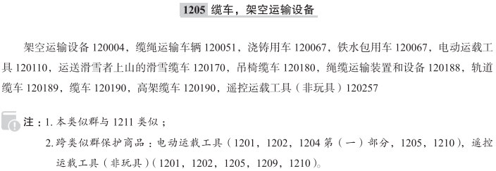 架空运输设备120004; 缆绳运输车辆120051; 浇铸用车120067; 铁水包用车120067; 电动运载工具120110; 运送滑雪者上山的滑雪缆车120170; 吊椅缆车120180; 绳缆运输装置和设备120188; 轨道缆车120189; 缆车120190; 高架缆车120190; 遥控运载工具(非玩具)120257; 装卸用架空缆车120349; 缆车悬挂臂;