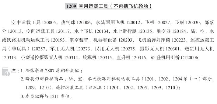 空中运载工具120005; 热气球120006; 水陆两用飞机120012; 飞机120027; 飞艇120030; 降落伞120113; 空间运载工具120117; 水上飞机120134; 水上滑行艇120135; 航空器120184; 陆、空、水或铁路用机动运载工具120193; 航空装置、机器和设备120203; 飞机的弹射座椅120223; 遥控运载工具(非玩具)120257; 军用无人机120273; 民用无人机120275; 摄影无人机120301; 送货用无人机120313; 小型遥控摄影无人机120314; 旋翼机120315; 直升机120316; 登机用引桥; 喷气式飞机; 旋翼飞机; 飞船; 涡轮喷气式飞机; 降落伞背带; 电动力航空器; 飞行员弹射座椅; 拦阻车辆运动用降落伞; 高空跳伞用降落伞; 飞机起落架轮子; 航空器用机翼; 侧旋翼飞机; 航空器起落架轮; 航空器油箱; 直升机旋翼桨叶; 滑翔机; 涡轮螺旋桨式飞机; 航空器起落架; 倾斜旋翼航空器; 运载工具用螺旋桨; 飞机螺旋桨; 航拍无人机(非玩具); 飞机座椅; 螺旋桨飞机; 航空器机身; 飞机机身; 直升飞机; 超轻型飞机; 轻型飞机; 无人驾驶飞机;