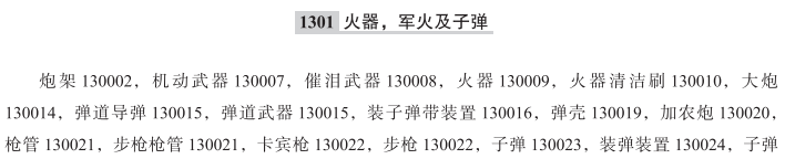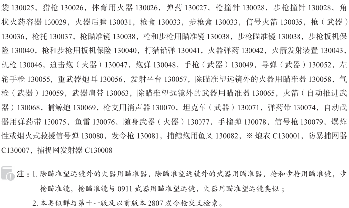 炮架130002; 机动武器130007; 催泪武器130008; 火器130009; 火器清洁刷130010; 大炮130014; 弹道导弹130015; 弹道武器130015; 装子弹带装置130016; 弹壳130019; 加农炮130020; 枪管130021; 步枪枪管130021; 卡宾枪130022; 步枪130022; 子弹130023; 装弹装置130024; 子弹袋130025; 猎枪130026; 体育用火器130026; 弹药130027; 步枪撞针130028; 枪撞针130028; 角状火药容器130029; 火器后膛130031; 枪盒130033; 步枪盒130033; 信号火箭130035; 枪(武器)130036; 枪托130037; 枪瞄准镜130038; 步枪瞄准镜130038; 枪和步枪用瞄准镜130038; 步枪扳机保险130040; 枪和步枪用扳机保险130040; 打猎铅弹130041; 火器弹药130042; 火箭发射装置130043; 机枪130046; 迫击炮(火器)130047; 炮弹130048; 手枪(武器)130049; 导弹(武器)130052; 左轮手枪130055; 重武器炮耳130056; 发射平台130057; 除瞄准望远镜外的火器用瞄准器130058; 气枪(武器)130059; 武器肩带130063; 除瞄准望远镜外的武器用瞄准器130065; 火箭(自动推进武器)130068; 捕鲸炮130069; 枪支用消声器130070; 坦克车(武器)130071; 弹药带130074; 自动武器用弹药带130075; 鱼雷130076; 随身武器(火器)130077; 手榴弹130078; 信号枪130079; 爆炸性或烟火式救援信号弹130080; 发令枪130081; 捕鲸炮用鱼叉130082; 巡航导弹130083; 炮衣; 防暴捕网器; 捕捉网发射器; 机枪弹; 枪口补偿器; 深水炸弹; 步枪专用包; 电传导武器; 枪支用弹托; 左轮手枪枪柄; 烟火发射装置; 手枪收纳箱; 猎枪弹; 用火箭推进的弹道导弹; 空对地导弹; 自动枪支用弹壳收集器; 红外线防御火箭用弹头; 火器专用便携箱; 轻武器用装弹设备; 火箭用烟雾弹; 已装药的炮弹; 装甲车和坦克用烟雾弹; 火器用两脚架; 水雷; 捕鲸炮(武器); 舰对空导弹; 制导导弹; 枪支专用包; 气弹枪; 弹丸枪; 枪械弹盒; 火器保险栓; 机枪子弹; 火器弹匣用快速装弹器; 枪炮噪声抑制器; 步枪弹药; 步枪子弹; 电击枪; 火器专用武器盒; 无后座力炮; 枪衣; 毒气弹(武器); 制导炮弹; 空投炸弹; 弹药升降机; 重炮; 烟火弹; 迫击炮弹; 投弹器; 高射炮; 自动枪; 步枪背带; 燃烧弹; 榴弹炮; 子弹带装弹机; 枪支用清洁刷; 穿甲弹; 自动手枪; 自动左轮手枪; 远程大炮; 火箭炮; 气枪; 反弹道导弹; 多弹头导弹; 精确制导导弹; 水下制导导弹; 枪支用子弹; 枪支支架; 军用步枪; 猎枪子弹; 带弹匣袋的手枪套; 信号弹; 手枪; 气枪子弹;
