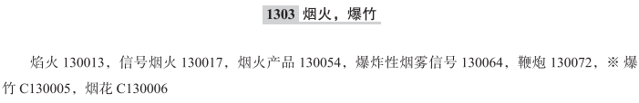 焰火130013; 信号烟火130017; 烟火产品130054; 爆炸性烟雾信号130064; 鞭炮130072; 爆竹; 烟花; 发光的爆炸性烟雾信号; 烟幕弹; 烽火信号; 烟雾信号;