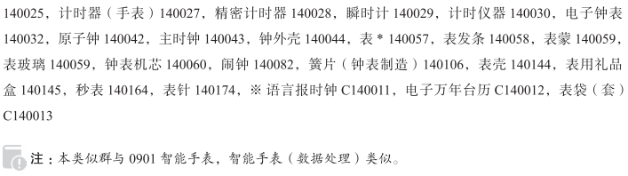 钟针140002; 钟140011; 摆(钟表制造)140013; 发条匣(钟表制造)140014; 手表140016; 手表带140017; 表带140017; 钟表盘(钟表制造)140021; 日晷140022; 钟表发条装置140023; 表链140025; 计时器(手表)140027; 精密计时器140028; 瞬时计140029; 计时仪器140030; 电子钟表140032; 原子钟140042; 主时钟140043; 钟外壳140044; 表140057; 表发条140058; 表蒙140059; 表玻璃140059; 钟表机芯140060; 闹钟140082; 簧片(钟表制造)140106; 表壳140144; 表用礼品盒140145; 秒表140164; 表针140174; 棋钟140188; 语言报时钟; 电子万年台历; 表袋(套); 钟外壳(钟的部件); 带有收音机的时钟; 时装表; 皮制手表带; 手表表冠; 潜水表; 手表机芯; 女士手表; 落地摆钟; 全自动手表; 钟表的摆; 内嵌收音机的时钟; 手表专用盒; 钟表; 贵金属制或镀有贵金属的表; 座钟; 钟摆; 手表表柄; 金属、皮革或塑料制表带; 户外用手表; 计时装置和仪器; 座钟壳; 钟罩; 钟表制造用钟表盘; 小型时钟; 怀表; 钟表指针; 旅行钟; 运动用表; 钟表指针(钟表制造); 手表自动上弦器; 机械手表; 手镯表; 表盒(礼品); 记时器(手表); 汽车用钟; 表袋; 表盘; 钟盘; LED指环表; 钟表发条; 电子计时仪器; 运动表; 钟表机件; 落地钟; 摆钟; 台钟; 表带扣; 挂钟; 运动手表;