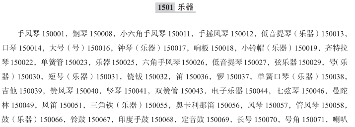 手风琴150001; 钢琴150008; 小六角手风琴150011; 手摇风琴150012; 低音提琴(乐器)150013; 口琴150014; 大号(号)150016; 钟琴(乐器)150017; 响板150018; 小铃帽(乐器)150019; 齐特拉琴150022; 单簧管150023; 乐器150025; 六角手风琴150026; 低音提琴150027; 弦乐器150029; 号(乐器)150030; 短号(乐器)150031; 铙钹150032; 笛150036; 锣150037; 单簧口琴(乐器)150038; 吉他150039; 簧风琴150040; 竖琴150041; 双簧管150043; 电子乐器150044; 七弦琴150046; 曼陀林150049; 风笛150051; 三角铁(乐器)150055; 奥卡利那笛150056; 风琴150057; 管风琴150058; 鼓(乐器)150066; 铃鼓150067; 印度手鼓150068; 定音鼓150069; 长号150070; 号角150071; 喇叭150072; 中提琴150074; 小提琴150075; 木琴150076; 胡琴150081; 竹笛150082; 琵琶150083; 笙150084; 唢呐150085; 手摇铃(乐器)150086; 音乐合成器150087; 萨克斯管150089; 巴拉莱卡琴(弦乐器)150090; 班卓琴150091; 口风琴150092; 机器人鼓150094; 颂钵150097; 鼓机150098; 儿童用乐器150099; 电子琴; 弹拨乐器; 打击乐器; 筝; 箫; 木鱼; 康茄舞鼓; 鼓声合成器; 杜西莫琴; 原声低音吉他; 次中音号; 低音吉他; 圆号; 编钟(乐器); 牛铃(乐器); 马林巴琴; 自动钢琴; 低音乐器; 金贝鼓; 原声吉他; 电低音吉他; 短竹笛; 巴松管; 伽倻琴(朝鲜十二弦琴); 玄琴(朝鲜六弦琴); 自动演奏的电子钢琴; 尤克里里琴(四弦吉他); 鲁特琴; 倍低音管; 英国管(中音双簧族乐器); 八孔竖笛; 低音鼓; 西塔琴; 卡祖笛; 簧(管)乐器; 三弦琴(日本乐器); 原声贝斯; 蛙鸣筒; 竹制竖管乐器(筚篥); 竹竖管乐器(笙); 尺八(日本竹笛); 太鼓(日本大鼓); 日本横笛; 日本鼓; 日本琵琶; 胡弓(日本乐器); 日本筝; 电钟琴; 埙; 钟琴; 吉他扶手; 钢鼓; 电贝司; 中式竹笛; 数码钢琴; 军鼓; 西式乐器; 键盘乐器; 电子风琴; 古筝; 电子音乐合成器; 电吉他; 叉铃; 管钟琴; 邦戈鼓; 二胡; 羊角号; 低音电吉他; 大键琴; 低音管; 短号; 沙槌; 大提琴; 木管乐器; 短笛; 大号; 管乐器; 铜管乐器;