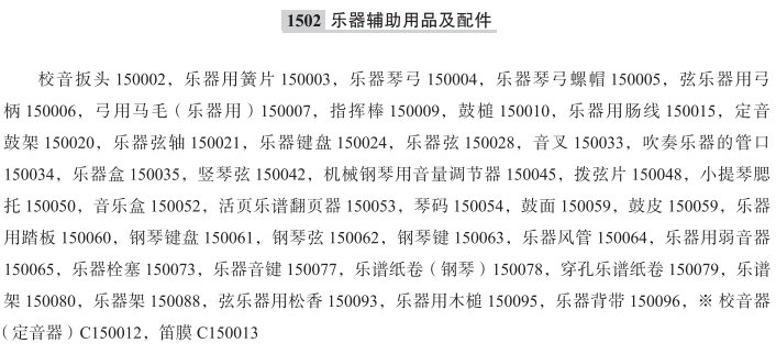 校音扳头150002; 乐器用簧片150003; 乐器琴弓150004; 乐器琴弓螺帽150005; 弦乐器用弓柄150006; 弓用马毛(乐器用)150007; 指挥棒150009; 鼓槌150010; 乐器用肠线150015; 定音鼓架150020; 乐器弦轴150021; 乐器键盘150024; 乐器弦150028; 音叉150033; 吹奏乐器的管口150034; 乐器盒150035; 竖琴弦150042; 机械钢琴用音量调节器150045; 拨弦片150048; 小提琴腮托150050; 音乐盒150052; 活页乐谱翻页器150053; 琴码150054; 鼓皮150059; 鼓面150059; 乐器用踏板150060; 钢琴键盘150061; 钢琴弦150062; 钢琴键150063; 乐器风管150064; 乐器用弱音器150065; 乐器栓塞150073; 乐器音键150077; 乐谱纸卷150078; 乐谱纸卷(钢琴)150078; 穿孔乐谱纸卷150079; 乐谱架150080; 乐器架150088; 弦乐器用松香150093; 乐器用木槌150095; 乐器背带150096; 校音器(定音器); 笛膜; 笛膜保护器; 乐器用松香; 大提琴用防滑垫; 吉他罩; 西洋乐器用弦; 电子乐器用调音器; 用于小军鼓的响弦; 古筝架; 二胡琴弦; 二胡演奏弓; 乐器用调音器; 风琴音节栓; 将开孔长笛变为闭孔长笛的塞子; 乐器用电子练习弱音器; 弦乐器用指板; 乐器双肩背带; 乐器用校音装置; 日式弦乐器用弦; 西方乐器用弦; 音乐盒(非玩具); 日式弦乐器用拨子; 低音鼓槌; 调音笛; 制小提琴琴弓用马毛; 乐器带; 鼓踏板; 乐器专用包; 弹日式乐器用指套; 吉他变调夹; 电子鼓垫; 大提琴尾柱; 低音提琴尾柱; 木管乐器管口用簧片; 吉他弦桥; 鼓垫; 吉他弦; 吉他拨片; 吉他背带;