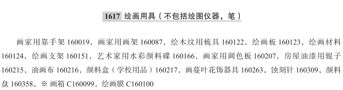 画家用靠手架160019; 画家用画架160087; 绘木纹用梳具160122; 绘画板160123; 绘画材料160124; 艺术家用水彩颜料碟160166; 画家用调色板160207; 房屋油漆用辊子160215; 油画布160216; 颜料盒(学校用品)160217; 画蔓叶花饰器具160263; 蚀刻针160309; 颜料盘160358; 画箱; 绘画膜; 水彩保湿盒; 画家用帆布衬板; 画架; 刷漆用辊; 丝绸画布(画家用物品); 绘画板(美术用品); 刷漆用辊子; 绘画板(画家用品); 黑板绘画材料; 水彩画用画板;