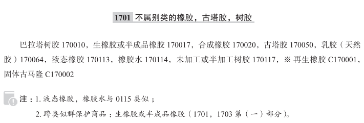 巴拉塔树胶170010; 生橡胶或半成品橡胶170017; 合成橡胶170020; 古塔胶170050; 乳胶(天然胶)170064; 液态橡胶170113; 橡胶水170114; 未加工或半加工树胶170117; 再生橡胶; 固体古马隆; 可降解合成橡胶; 氟橡胶; 聚硫橡胶; 生橡胶; 丙烯酸酯橡胶; 氯化橡胶; 硅橡胶; 天然橡胶; 工业用乳胶; 泡沫橡胶; 丁苯橡胶; 乙丙橡胶; 丁腈橡胶; 丁基橡胶;