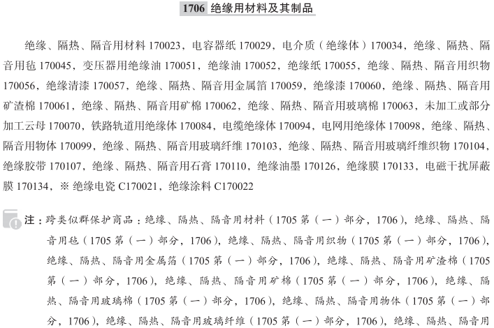 绝缘、隔热、隔音用材料170023; 电容器纸170029; 电介质(绝缘体)170034; 绝缘、隔热、隔音用毡170045; 变压器用绝缘油170051; 绝缘油170052; 绝缘纸170055; 绝缘、隔热、隔音用织物170056; 绝缘清漆170057; 绝缘、隔热、隔音用金属箔170059; 绝缘漆170060; 绝缘、隔热、隔音用矿渣棉170061; 绝缘、隔热、隔音用矿棉170062; 绝缘、隔热、隔音用玻璃棉170063; 未加工或部分加工云母170070; 铁路轨道用绝缘体170084; 电缆绝缘体170094; 电网用绝缘体170098; 绝缘、隔热、隔音用物体170099; 绝缘、隔热、隔音用玻璃纤维170103; 绝缘、隔热、隔音用玻璃纤维织物170104; 绝缘胶带170107; 绝缘、隔热、隔音用石膏170110; 绝缘油墨170126; 绝缘膜170133; 电磁干扰屏蔽膜170134; 电磁波吸波纸170137; 绝缘、隔热、隔音用聚酯短纤维170140; 绝缘电瓷; 绝缘涂料; 绝缘材料; 绝缘胶布; 绝缘体; 绝缘毡; 电绝缘胶带; 绝缘用玻璃纤维织物; 绝缘织物; 服装、鞋和睡袋用绝缘材料; 矿棉(绝缘体); 电陶瓷绝缘体; 铁路轨道绝缘物; 绝缘、隔热、隔音用石墨板; 电绝缘漆; 绝缘用金属箔; 矿渣棉(绝缘体); 绝缘板; 绝缘用玻璃棉; 电绝缘云母制品; 电绝缘体; 电绝缘胶布; 电气绝缘用塑料薄膜; 绝缘、隔热、隔音用竹纤维; 电绝缘橡胶制品; 电绝缘材料; 空调用绝缘材料; 绝缘灰浆; 绝缘用玻璃纤维;