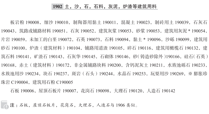 石板190006; 屋顶石板片190007; 板岩粉190008; 细沙190010; 制陶器用黏土190011; 混凝土190023; 制砖用土190039; 石灰石190043; 筑路或铺路材料190051; 石灰190052; 砂浆190053; 建筑灰浆190053; 建筑用灰泥190054; 片岩190059; 未加工的白垩190072; 建筑用石英190073; 石料190094; 黏土190096; 花岗石190098; 沙砾190099; 建筑用砂石190100; 炉渣(建筑材料)190104; 铺路用道渣190105; 碎石190116; 大理石190120; 建筑用橄榄石190132; 建筑石料190141; 人造石190142; 矿渣石190143; 石灰华190145; 石砌体190146; 砂(铸造砂除外)190166; 硅石(石英)190168; 赤土(建筑材料)190172; 非金属铺路块料190200; 含钙泥灰土190211; 水族池砾石190233; 水族池用沙190234; 块石190237; 斑岩(石头)190244; 水晶石190253; 玩耍用沙190269; 膨胀珍珠岩; 建筑用石粉; 大理石(建筑材料); 煤矸石; 铺路石; 建筑用冻石; 建筑沙; 屋顶覆盖层用石板; 幕墙用石板; 灌浆混合物; 巨石; 建筑用闪石; 建筑用水晶石; 建筑用蛇纹石; 建筑用凝灰岩; 石材贴面(建筑材料); 火磨石(砂岩); 建筑用黏合灰泥; 黏土灰; 建筑用黏结灰浆; 水族箱装饰石; 建筑用矿石颗粒; 土木工程用工业混凝土; 建筑或工程用非金属矿物; 用于建筑施工的自流平混凝土; 瓷石; 砂石; 长石; 建筑用沙袋; 墙石; 饰面砂浆; 方解石; 流纹岩; 卵石; 混凝土块; 火山灰; 天然石材; 彩色闪光环氧灌浆料; 建筑用石灰; 基石; 沙; 硅石; 即用型混凝土; 陶土(原材料); 赤土; 耐火混凝土; 混凝土块料; 灰浆;