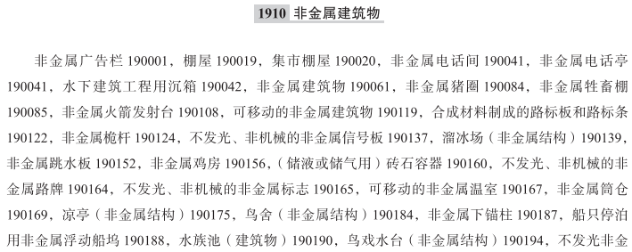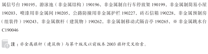 非金属广告栏190001; 棚屋190019; 集市棚屋190020; 非金属电话亭190041; 非金属电话间190041; 水下建筑工程用沉箱190042; 非金属建筑物190061; 非金属猪圈190084; 非金属牲畜棚190085; 非金属火箭发射台190108; 可移动的非金属建筑物190119; 合成材料制成的路标板和路标条190122; 非金属桅杆190124; 不发光、非机械的非金属信号板190137; 溜冰场(非金属结构)190139; 非金属跳水板190152; 非金属鸡房190156; (储液或储气用)砖石容器190160; 不发光、非机械的非金属路牌190164; 不发光、非机械的非金属标志190165; 可移动的非金属温室190167; 非金属筒仓190169; 凉亭(非金属结构)190175; 鸟舍(非金属结构)190184; 非金属下锚柱190187; 船只停泊用非金属浮动船坞190188; 水族池(建筑物)190190; 鸟戏水台(非金属结构)190194; 不发光非金属信号台190195; 游泳池(非金属结构)190196; 非金属制自行车停放架190199; 非金属制简易小屋190203; 喷漆用非金属间190205; 公路防撞用非金属护栏190227; 砖石信箱190228; 非金属预制房(组装件)190243; 非金属旗杆(建筑物)190262; 非金属制移动式隔音亭190265; 非金属跳水台; 非金属预制隔音间; 非金属材料制花园棚; 砖石贮存容器; 不发光的非金属灯塔(塔状结构); 石灯笼(石头制庭院装饰物); 便携式非金属堤坝; 预制原木房屋; 家用砖石制贮水容器; 防撞用非金属护栏; 便携式露台(非金属制); 可移动木建筑物; 非金属移动式建筑; 贮液用砖石容器(工业用); 家用砖石制储水容器; 砖石储存容器; 储液用砖石容器(工业用); 非金属鸟舍; 道路用非金属隔离栏; 非金属人工鱼礁; 非金属可移动建筑物; 非金属预制房(成套组件); (贮液或贮气用)砖石容器; 鸟食台(非金属结构); 非金属地下仓库; 家用可移动的非金属温室;
