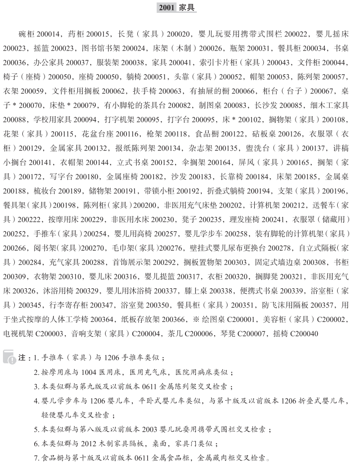 碗柜200014; 药柜200015; 长凳(家具)200020; 婴儿玩耍用携带式围栏200022; 婴儿摇床200023; 摇篮200023; 图书馆书架200024; 床架(木制)200026; 瓶架200031; 餐具柜200034; 书桌200036; 办公家具200037; 服装架200038; 家具200041; 索引卡片柜(家具)200043; 文件柜200044; 座椅200050; 椅子(座椅)200050; 躺椅200051; 头靠(家具)200052; 帽架200053; 陈列架(家具)200057; 衣架200059; 文件柜用搁板200062; 扶手椅200063; 有抽屉的橱200066; 柜台(台子)200067; 桌子200070; 床垫200079; 有小脚轮的茶具台200082; 制图桌200083; 长沙发200085; 细木工家具200088; 学校用家具200094; 打字台200095; 打字机架200095; 床200102; 搁物架(家具)200108; 花架(家具)200115; 花盆台座200116; 枪架200118; 食品橱200122; 砧板桌200126; 衣服罩(衣柜)200129; 金属家具200132; 报纸陈列架200134; 杂志架200135; 盥洗台(家具)200137; 讲稿小搁台200141; 衣帽架200144; 立式书桌200152; 伞搁架200164; 屏风(家具)200165; 搁架(家具)200172; 写字台200180; 金属座椅200182; 沙发200183; 长靠椅200184; 床架200185; 金属桌200188; 梳妆台200189; 储物架200191; 带锁小柜200192; 折叠式躺椅200194; 支架(家具)200196; 餐具架(家具)200198; 陈列柜(家具)200200; 非医用充气床垫200202; 计算机架200212; 送餐车(家具)200222; 按摩用床200229; 非医用水床200230; 凳子200235; 理发座椅200241; 衣服罩(储藏用)200252; 手推车(家具)200254; 婴儿用高椅200257; 婴儿学步车200258; 装有脚轮的计算机架(家具)200266; 阅书架(家具)200270; 毛巾架(家具)200276; 壁挂式婴儿尿布更换台200278; 自立式隔板(家具)200284; 充气家具200288; 首饰展示架200292; 搁板置物架200303; 固定式墙边桌200308; 书柜200309; 衣物架200310; 婴儿床200316; 婴儿提篮200317; 衣柜200320; 搁脚凳200321; 非医用充气床200326; 沐浴用椅200329; 婴儿用沐浴椅200337; 膝上桌200338; 便携式书桌200339; 浴室柜(家具)200345; 行李寄存柜200347; 浴室凳200350; 餐具柜(家具)200351; 防飞沫用隔板200357; 用于坐式按摩的人体工学椅200364; 纸板存放架200366; 桌用计算机键盘托200375; 打坐凳200383; 祭台(家具)200385; 绘图桌; 美容柜(家具); 电视机架; 音响支架(家具); 茶几; 琴凳; 摇椅; 非金属盛肉柜; 金属货架; 大理石桌; 贮存架; 书架; 金属储物柜; 展示桌; 冲浪板展示架; 浴室柜橱; 服装陈列架; 便携式摇篮; 运动场用长凳; 露营家具; 钥匙柜; 乳胶床垫; 可调床; 长椅子; 露营桌; 图书架; 木床; 可升降的桌子; 行动不便者用椅; 家用神龛; 木材替代品制家具; 芦苇制屏风; 日式茶具柜; 弹簧床垫; 餐桌; 金属橱柜; 边桌(家具); 理发用椅子; 折叠搁架; 木砧板桌子; 座椅家具; 门廊秋千椅; 植物搁架; 庭院用塑料家具; 商品展示柜; 化妆台(梳妆台); 斜靠背扶手椅; 商品陈列用家具; 房屋、办公室和花园用家具; 日式靠手; 日式无腿靠椅; 东方折壁式屏风; 东方单板屏风; 美容用躺椅; 柔韧木材制床垫; 无腿橱柜; 双层床; 杂志架(家具); 仿古家具; 安乐椅; 椅子; 花盆架; 曲木家具; 软垫家具; 商品展示架(家具); 演示板(家具); 榻榻米专用座椅; 浴室柜子(家具); 行李搁架(家具); 沙发床; 幼儿围栏; 边桌; 餐椅; 脚凳; 竹制家具; 婴儿尿布更换台; 展示架; 钢管制家具; 坐卧两用折椅; 带镜子的橱柜; 阅览架; 吧椅; 米柜; 双人沙发; 箱型弹簧床垫; 便携式可折叠体育场座椅; 豆袋沙发; 办公室用座椅; 定制的厨房家具; 档案架(家具); 酒架; 宴会椅; 旅行用婴儿床; 便携式婴儿摇床; 充气椅; 展示柜; 户外家具; 野营用家具; 办公用椅; 金属搁架; 折叠床; 搁板桌; 餐具架; 非医用水压床; 儿童家具; 软凳; 折叠桌; 办公室用扶手椅; 钓鱼用椅; 卧室家具; 折叠椅; 软垫椅; 鞋柜; 按摩用椅; 玩具箱(家具); 木柴存放架; 橱柜; 厨房碗柜; 浴室用家具; 餐边柜; 客厅家具; 床护栏; 金属陈列柜; 办公桌; 木制家具; 金属柜; 休闲椅(家具); 理发用椅; 浴室柜; 三镜梳妆台; 尿布更换台; 床头柜; 金属工具柜; 便携式婴儿床; 行李架(家具); 定制的碗柜; 装在墙上的尿布更换台; 木制床架; 野营用充气床垫;