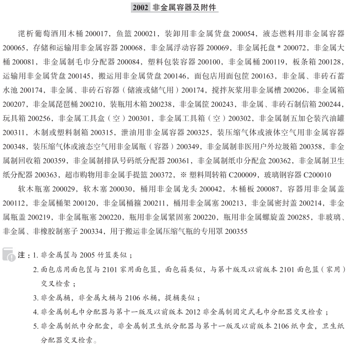 滗析葡萄酒用木桶200017; 鱼篮200021; 软木瓶塞200029; 软木塞200030; 桶用非金属龙头200042; 装卸用非金属货盘200054; 液态燃料用非金属容器200065; 存储和运输用非金属容器200068; 非金属浮动容器200069; 非金属托盘200072; 非金属大桶200081; 非金属制毛巾分配器200084; 木桶板200087; 塑料包装容器200100; 容器用非金属盖200112; 非金属桶200119; 非金属桶架200120; 存储和运输用非金属板条箱200128; 运输用非金属货盘200145; 搬运用非金属货盘200146; 面包店用面包筐200163; 非金属、非砖石容器(储液或储气用)200174; 非金属、非砖石蓄水池200174; 搅拌灰浆用非金属槽200206; 非金属箱200207; 非金属琵琶桶200210; 非金属桶箍200211; 桶用非金属塞200213; 非金属密封盖200214; 非金属瓶盖200219; 瓶用非金属紧固塞200220; 非金属瓶塞200220; 装瓶用木箱200238; 非金属筐200243; 非金属、非砖石制信箱200244; 玩具箱200256; 瓶用非金属螺旋盖200285; 非金属工具盒(空)200301; 非金属工具箱(空)200302; 非金属制五加仑装汽油罐200311; 木制或塑料制箱200315; 泄油用非金属容器200325; 非玻璃、非金属、非橡胶制塞子200334; 装压缩气体或液体空气用非金属容器200348; 装压缩气体或液态空气用非金属瓶(容器)200349; 用于搬运非金属压缩气瓶的专用罩200355; 非金属制非医用户外垃圾箱200358; 非金属制回收箱200359; 非金属制排队号码纸分配器200361; 非金属制纸巾分配盒200362; 非金属制卫生纸分配器200363; 超市购物用非金属手提篮200372; 非金属制垃圾箱(非家用)200376; 非金属制垃圾桶(非家用)200376; 非金属制皂液分配器200378; 塑料周转箱; 玻璃钢容器; 瓶用塑料塞; 非金属制固定式毛巾分配器; 邮寄用塑料卷筒; 非金属、非石制工业用贮水池; 非金属、非砖石制气体贮藏罐; 工业包装容器用塑料瓶塞; 工业包装容器用木制盖子; 工业包装容器用木塞; 非金属、非砖石贮液容器; 软木制塞; 仿软木制塞; 非金属、非砖石制贮存容器(贮液或贮气用); 塑料贮存容器; 木制贮藏罐; 木箱; 非金属工具箱(空的); 瓶用非玻璃、非金属、非橡胶塞子; 非金属、非砖石容器(贮液或贮气用); 木制琵琶桶; 运输用非金属容器; 桶用非金属活嘴; 工业用塑料包装容器; 竹制工业包装容器; 非金属、非砖石制储存容器(储液或储气用); 非金属、非石制工业用储水池; 非金属、非砖石制气体储藏罐; 非金属、非砖石储液容器; 木制储藏罐; 食品包装用塑料托盘; 木制工业包装容器; 塑料盒; 塑料托盘; 塑料储存容器; 家用非金属、非砖石水箱; 非金属、非砖石信箱; 工业用竹篮; 工业包装用木箱;