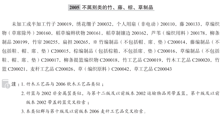 未加工或半加工竹子200019; 绣花绷子200032; 个人用扇(非电动)200110; 未加工或半加工的藤200133; 草编织物(草席除外)200160; 稻草编辫状物200161; 稻草制镶边200162; 芦苇(编织用料)200178; 柳条制品200199; 竹帘200255; 扁担200265; 竹编制品(不包括帽、席、垫); 藤编制品(不包括鞋、帽、席、垫); 棕编制品(包括棕箱,不包括席、垫); 草编制品(不包括鞋、帽、席、垫); 柳条提篮编织物; 竹工艺品; 竹木工艺品; 竹篮; 麦秆工艺品; 草(编织原料); 草工艺品; 未加工的藤; 半加工的藤; 手持折扇; 藤条制小雕像; 藤(未加工或半加工原料); 苇、藤或竹制遮光帘; 手持平扇; 竹制工艺品;
