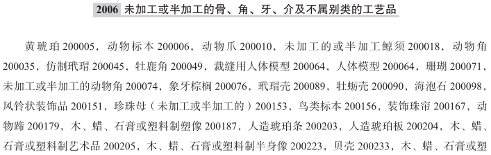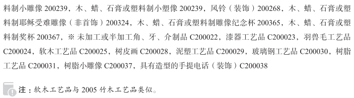 黄琥珀200005; 动物标本200006; 动物爪200010; 未加工的或半加工鲸须200018; 动物角200035; 仿制玳瑁200045; 牡鹿角200049; 人体模型200064; 裁缝用人体模型200064; 珊瑚200071; 未加工或半加工的动物角200074; 象牙棕榈200076; 玳瑁壳200089; 牡蛎壳200090; 海泡石200098; 风铃状装饰品200151; 珍珠母(未加工或半加工的)200153; 鸟类标本200156; 装饰珠帘200167; 动物蹄200179; 木、蜡、石膏或塑料制塑像200187; 人造琥珀条200203; 人造琥珀板200204; 木、蜡、石膏、塑料或树脂制艺术品200205; 木、蜡、石膏或塑料制艺术品200205; 木、蜡、石膏或塑料制半身像200223; 贝壳200233; 木、蜡、石膏或塑料制小雕像200239; 木、蜡、石膏或塑料制小塑像200239; 风铃(装饰)200268; 木、蜡、石膏或塑料制雕像纪念杯200365; 木、蜡、石膏或塑料制奖杯200367; 种子制小雕像200386; 未加工或半加工角、牙、介制品; 漆器工艺品; 羽兽毛工艺品; 软木工艺品; 树皮画; 泥塑工艺品; 玻璃钢工艺品; 树脂工艺品; 树脂小雕像; 具有造型的手提电话(装饰); 琥珀小雕像; 塑料制塑像; 蜡制艺术品; 木制雕塑; 贝壳(未加工或半加工的); 装饰风铃; 塑料制艺术品; 海螺壳; 动物牙(未加工或半加工材料); 展示服装用人体模特模型; 捕梦网(装饰品); 玳瑁壳(未加工或半加工材料); 珊瑚(未加工或半加工的); 骨制小雕像; 木、蜡、石膏或塑料制盾形纪念牌; 木雕; 蜡像; 树脂小塑像; 石膏塑像; 石膏制小雕像; 坚果壳制工艺品; 人造琥珀制小雕像; 木制艺术品; 海贝壳; 仿制玳瑁壳; 塑料雕塑; 人造琥珀制艺术品; 风铃; 海泡石(未加工或半加工材料); 琥珀艺术品; 木、蜡、石膏或塑料制半身雕像; 人造兽角; 石膏制艺术品;