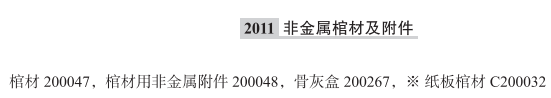 棺材200047; 棺材用非金属附件200048; 骨灰盒200267; 纸板棺材;