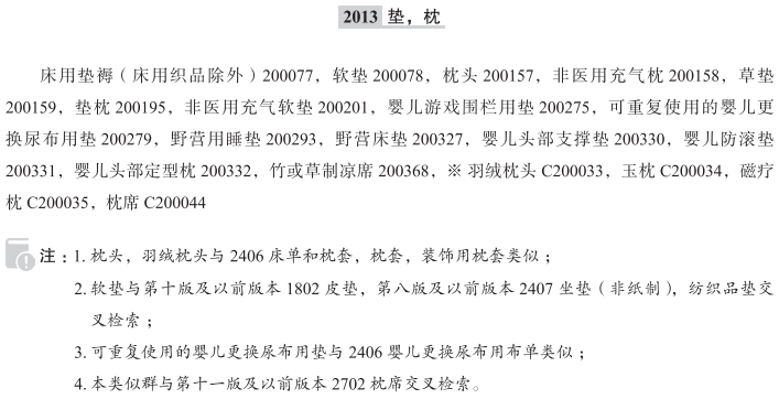 床用垫褥(床用织品除外)200077; 软垫200078; 枕头200157; 非医用充气枕200158; 草垫200159; 垫枕200195; 非医用充气软垫200201; 婴儿游戏围栏用垫200275; 可重复使用的婴儿更换尿布用垫200279; 野营用睡垫200293; 野营床垫200327; 婴儿头部支撑垫200330; 婴儿防滚垫200331; 婴儿头部定型枕200332; 竹或草制凉席200368; 浴枕200374; 哺乳枕200377; 打坐用软垫200381; 瑜伽枕200382; 瑜伽垫枕200384; 羽绒枕头; 玉枕; 磁疗枕; 枕席; 可充气枕头; 抱枕; 婴儿抱枕; 孕妇用枕; 用毛发填充的软垫; 可充气颈垫; 颈部靠垫; 颈部靠枕; 椅垫; 乳胶枕头; 荞麦填充枕; U形枕; 竹枕; 非医用充气垫; 头部支撑枕; 非医用气垫; 软垫(家具); 哺乳用枕头; 午睡垫; 旅行枕头; 可重复使用的尿布更换垫; 非医用气枕; 颈枕; 蚕丝枕;