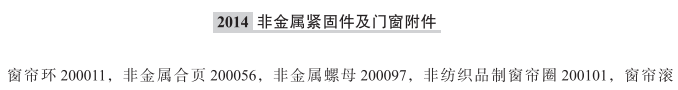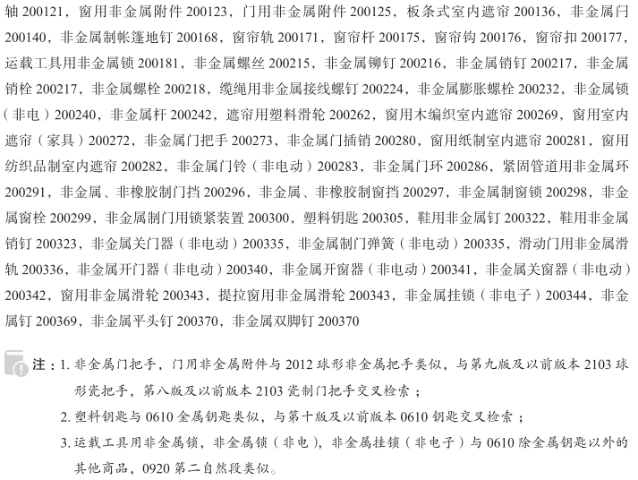 窗帘环200011; 非金属合页200056; 非金属螺母200097; 安装在墙上的窗帘钩200101; 窗帘滚轴200121; 窗用非金属附件200123; 门用非金属附件200125; 板条式室内遮帘200136; 非金属闩200140; 非金属制帐篷地钉200168; 窗帘轨200171; 窗帘杆200175; 窗帘钩200176; 非纺织品制窗帘扣200177; 运载工具用非金属锁200181; 非金属螺丝200215; 非金属铆钉200216; 非金属销钉200217; 非金属销栓200217; 非金属螺栓200218; 缆绳用非金属接线螺钉200224; 非金属膨胀螺栓200232; 非金属锁(非电)200240; 非金属杆200242; 遮帘用塑料滑轮200262; 窗用木编织室内遮帘200269; 窗用室内遮帘(家具)200272; 非金属门把手200273; 非金属门插销200280; 窗用纸制室内遮帘200281; 窗用纺织品制室内遮帘200282; 非金属门铃(非电动)200283; 非金属门环200286; 紧固管道用非金属环200291; 非金属、非橡胶制门挡200296; 非金属、非橡胶制窗挡200297; 非金属制窗锁200298; 非金属窗栓200299; 非金属制门用锁紧装置200300; 塑料钥匙200305; 鞋用非金属钉200322; 鞋用非金属销钉200323; 非金属关门器(非电动)200335; 非金属制门弹簧(非电动)200335; 滑动门用非金属滑轨200336; 非金属开门器(非电动)200340; 非金属开窗器(非电动)200341; 非金属关窗器(非电动)200342; 提拉窗用非金属滑轮200343; 窗用非金属滑轮200343; 非金属挂锁(非电子)200344; 非金属钉200369; 非金属双脚钉200370; 非金属平头钉200370; 金属制室内百叶窗帘; 非金属门闩; 非金属扣钉; 木编织百叶帘(家具); 室内窗用百叶帘(家具); 室内窗用遮光帘(家具); 纺织品制室内窗用百叶帘; 纸制百叶帘; 浴帘杆; 金属窗帘轨; 塑料门把手; 非金属螺纹钉; 木制门挡; 淋浴帘挂杆; 窗用室内百叶帘; 浴帘挂钩; 塑料门挡; 非金属锁芯; 金属窗帘杆; 室内软百叶帘; 瓷制门把手; 非金属窗帘杆; 室内百叶帘; 窗帘用塑料滑轮; 非金属浴帘杆; 竹制室内遮帘; 非金属窗帘轨; 木钉; 非金属制挂画钩; 浴帘环; 非金属窗把手;