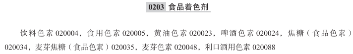 饮料色素020004; 食用色素020005; 黄油色素020023; 啤酒色素020024; 焦糖(食品色素)020034; 麦芽焦糖(食品色素)020035; 麦芽色素020048; 利口酒用色素020088; 食品装饰用可食用上光剂020142; 食品和饮料用着色剂; 制造饮料用焦糖色素; 制造食品用焦糖色素; 生产食物用色素; 用作食品色素的焦糖; 生产饮料用色素; 食品用着色剂; 家用食品色素;