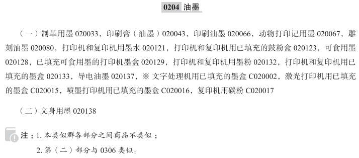 制革用墨020033; 印刷膏(油墨)020043; 印刷油墨020066; 动物打印记用墨020067; 雕刻油墨020080; 打印机和复印机用墨水020121; 打印机和复印机用已填充的鼓粉盒020123; 可食用墨020128; 已填充可食用墨的打印机墨盒020129; 打印机和复印机用墨粉020132; 打印机和复印机用已填充的墨盒020133; 导电油墨020137; 文身用墨020138; 文字处理机用已填充的墨盒; 激光打印机用已填充的墨盒; 喷墨打印机用已填充的墨盒; 复印机用碳粉; 打印机和复印机用碳粉; 印刷机用已填充的碳粉盒; 静电复印用色粉; 打印碳粉; 列表机用墨水; 金属油墨; 复印机用墨; 印刷合成物(油墨); 打印机和影印机用碳粉盒(填满的); 已填充的打印机墨盒; 印刷用金属墨水; 用作油墨干燥剂的催干剂; 纺织品着色用油墨; 胶版印刷用油墨; 凹版油墨; 静电复印用墨; 柔版印刷用胶囊香味油墨; 金粉油墨; 热致变色油墨; 喷墨墨盒(已填充); 平版印刷油墨; 凸版印刷油墨; 打印机墨水; 干油墨; 喷墨打印机用墨水; 传真机用已填充墨盒; 传真机用已填充鼓粉盒; 已填充的鼓粉盒; 激光打印机用已填充的鼓粉盒; 喷墨打印机用已填充的鼓粉盒; 已填充的喷墨打印墨盒; 油印油墨; 丝网印刷用油墨; 复印油墨;